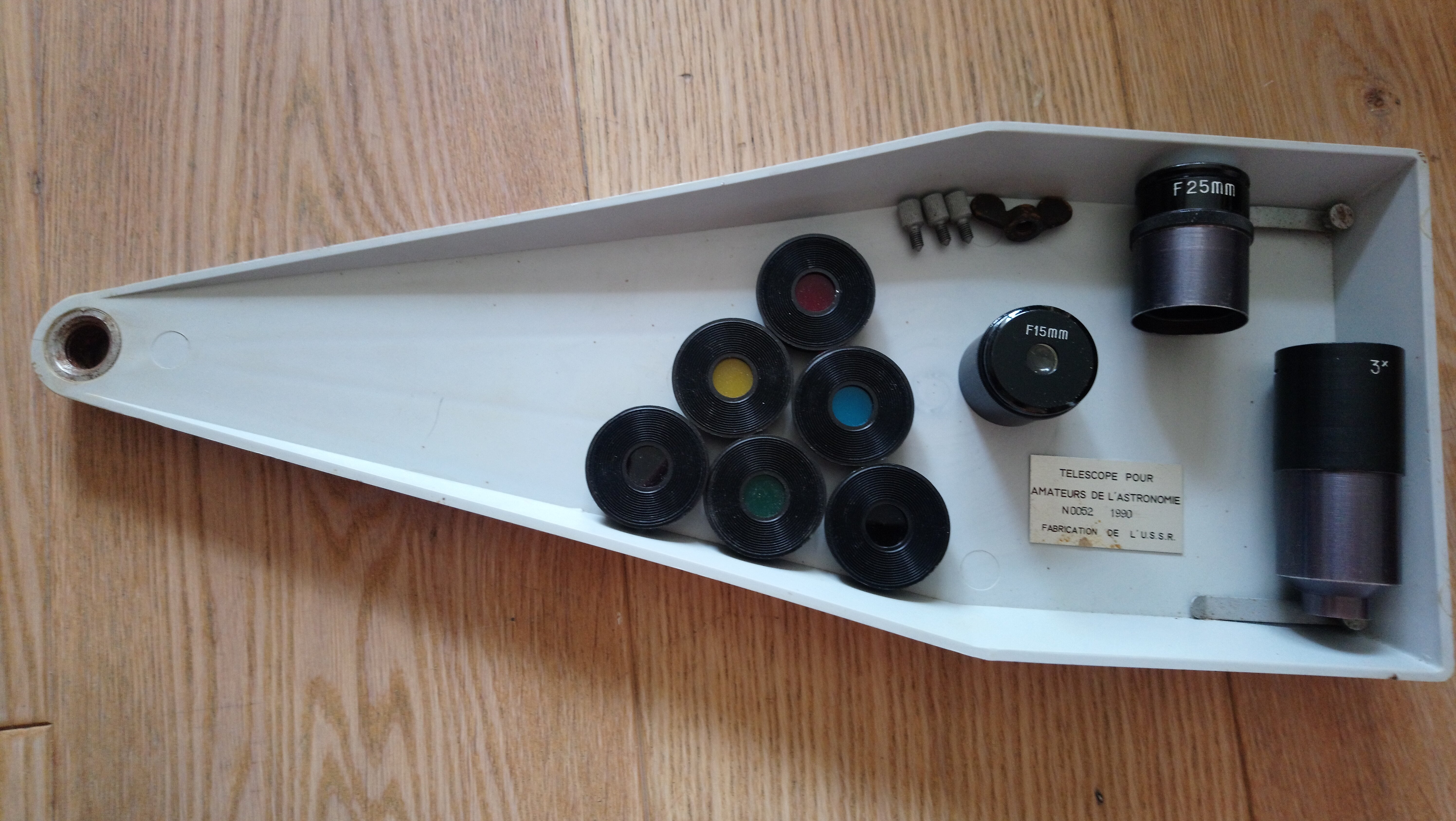 Arya78 Posté 12 septembre 2021 Posté 12 septembre 2021 Bonjour à tous, Nous avons "hérité" avec mon mari du télescope dont je joins les photos. La malle est très grande et nous sommes en appartement, donc nous souhaiterions nous en séparer quite à acheter quelque chose de moins encombrant par la suite. Malgré des recherches approfondies sur internet, je ne parviens pas à identifier ce matériel, et n'y connaissant pas grand chose, à savoir quelle est sa qualité et sa valeur. Les seules indications sont l'inventaires à l'intérieur de la boîte, et la plaque indiquant : "Télescope pour amateur de l'astronomie - N0052 - 1990 - Fabrication de l'U.S.S.R." (!) Merci par avance pour vos éclaircissements ! 😉 Bon dimanche Arya