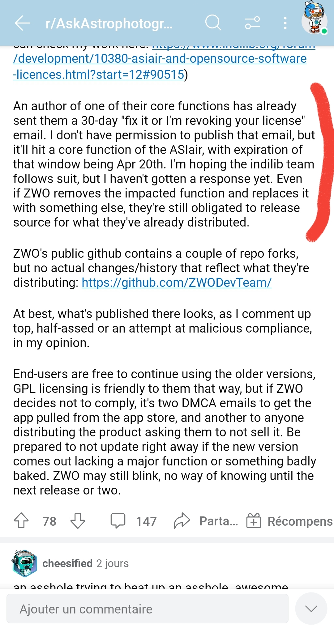 @gehelem si ça peut les faire bouger un peu plus qu'il y un an, tant mieux. Je reste dubitatif sur le coup de "l'arme nucléaire" avec requêtes DMCA auprès d'Apple et Google, seuls les auteurs des libs GPL (ou des LGPL que ZWO n'a même pas pris la peine de linker correctement) peuvent légalement le faire, non ?