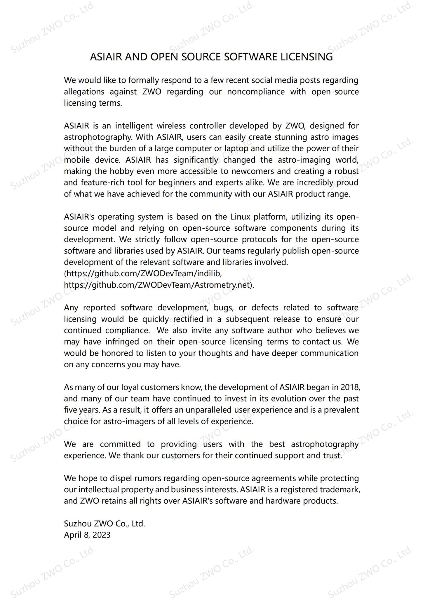 "We strictly follow open-source protocols for the open-source software and libraries used by ASIAIR"