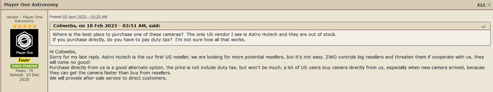 En gros ZWO fait pression sur les revendeurs US pour avoir l'exclusivité => exit les petits nouveaux comme player one.