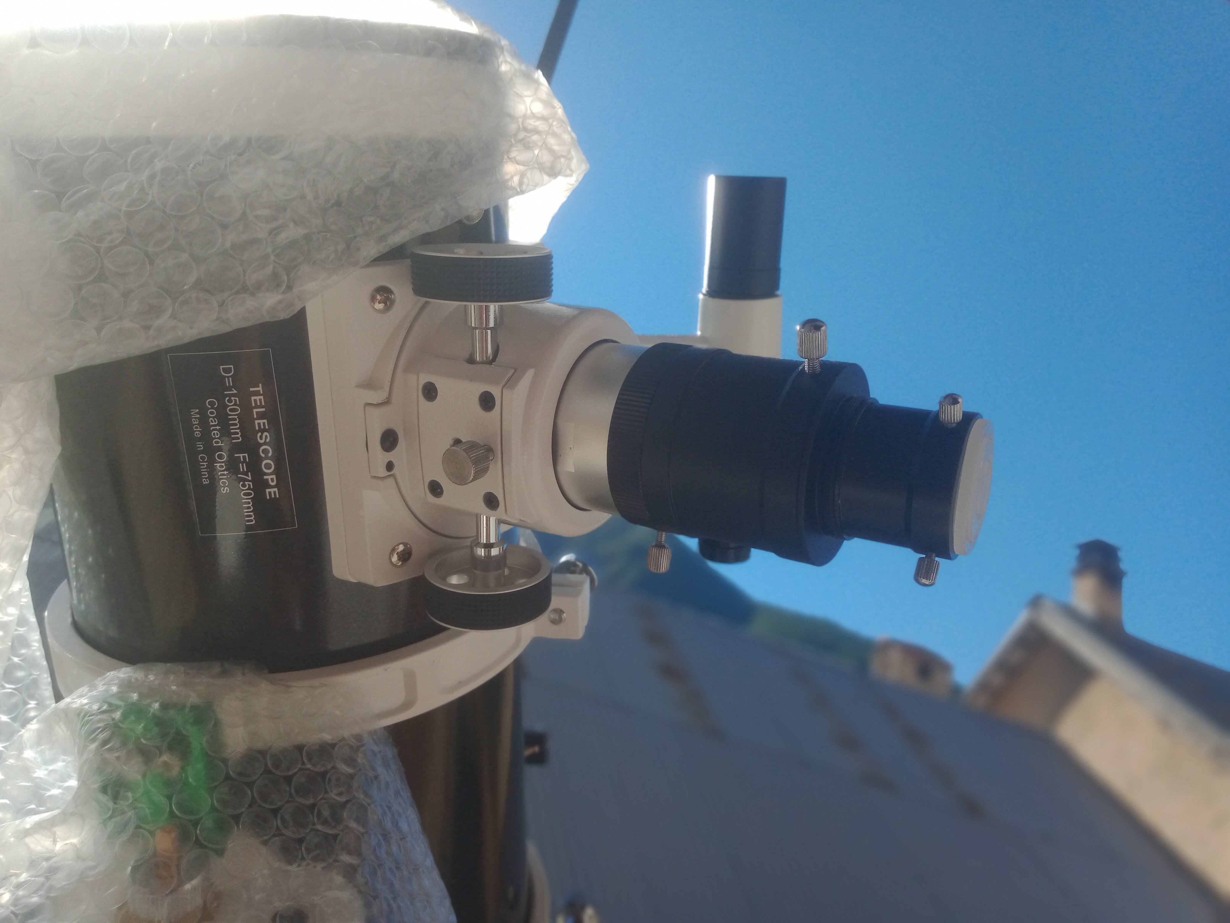 ( désolé je n'ai pas encore les termes techniques ) ensuite une lunette ( télescope ) ou sera branché la caméra de guidage, et quand c'est sur ce setup je vois de très prêt très bien mais des que le tube gris est complétement replié grâce a la molette me permettant d'aller vers les étoiles bah je ne peux pas acceder aux étoile il ne va pas assez loin, et la avec ce setup je vois dans le reflex le toit nikel mis au point de la maison en face.