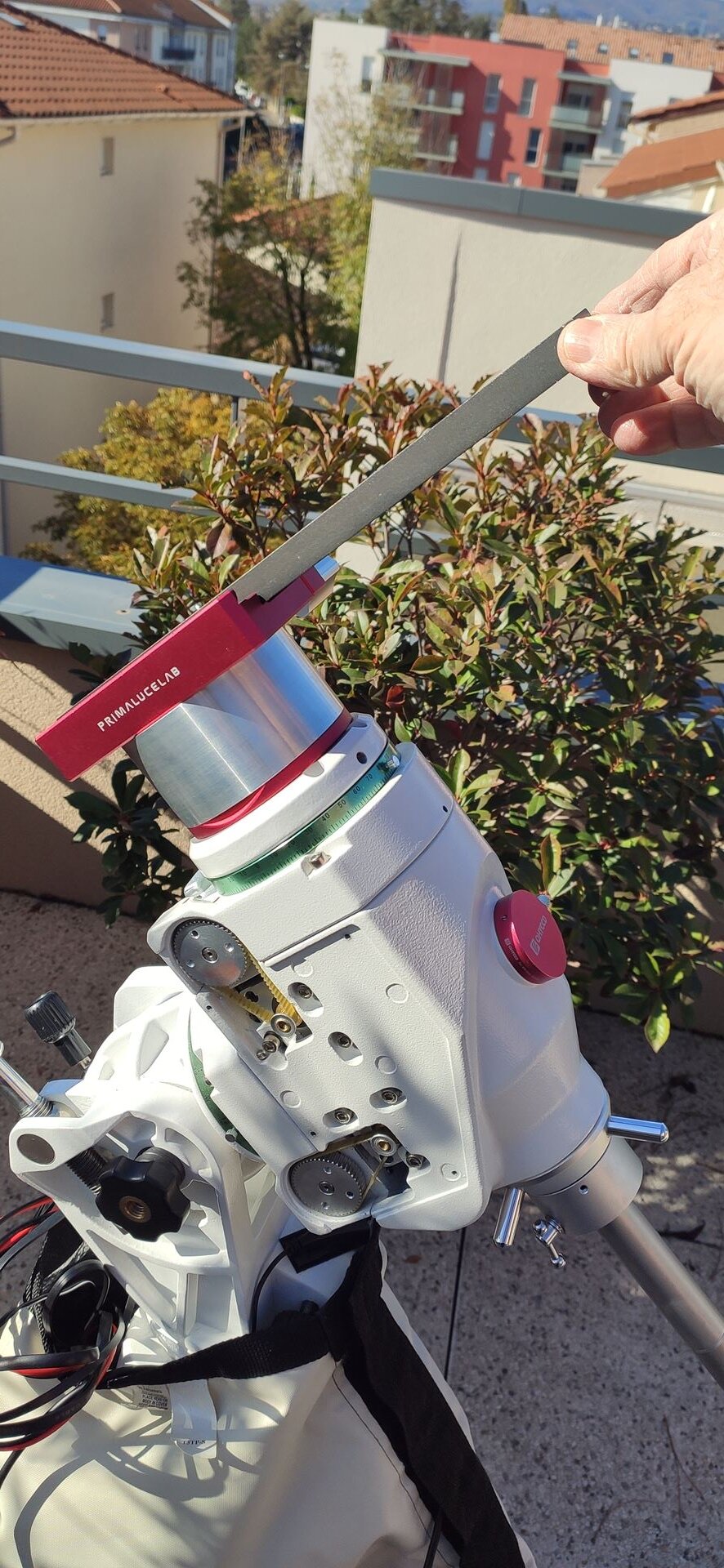 Merci beaucoup pour ces infos détaillées ! J'ai légèrement desserré l'écrou en bout d'axe, qui était à la base moins serré que le tien, et aussi supprimé les frottements qui venaient du cercle de coordonnées en DEC en le bloquant le plus haut possible. Ça me paraît plus fluide maintenant. J'ai testé hier soir, c'est un peu mieux sans être décisif mais, hasard ou pas, le suivi en RA n'était pas terrible (dents de scie ±1.5"). J'essaie de ne pas toucher aux jeux pour l'instant car elle sort de réglage chez PA mais il faudra peut-être m'y résoudre..