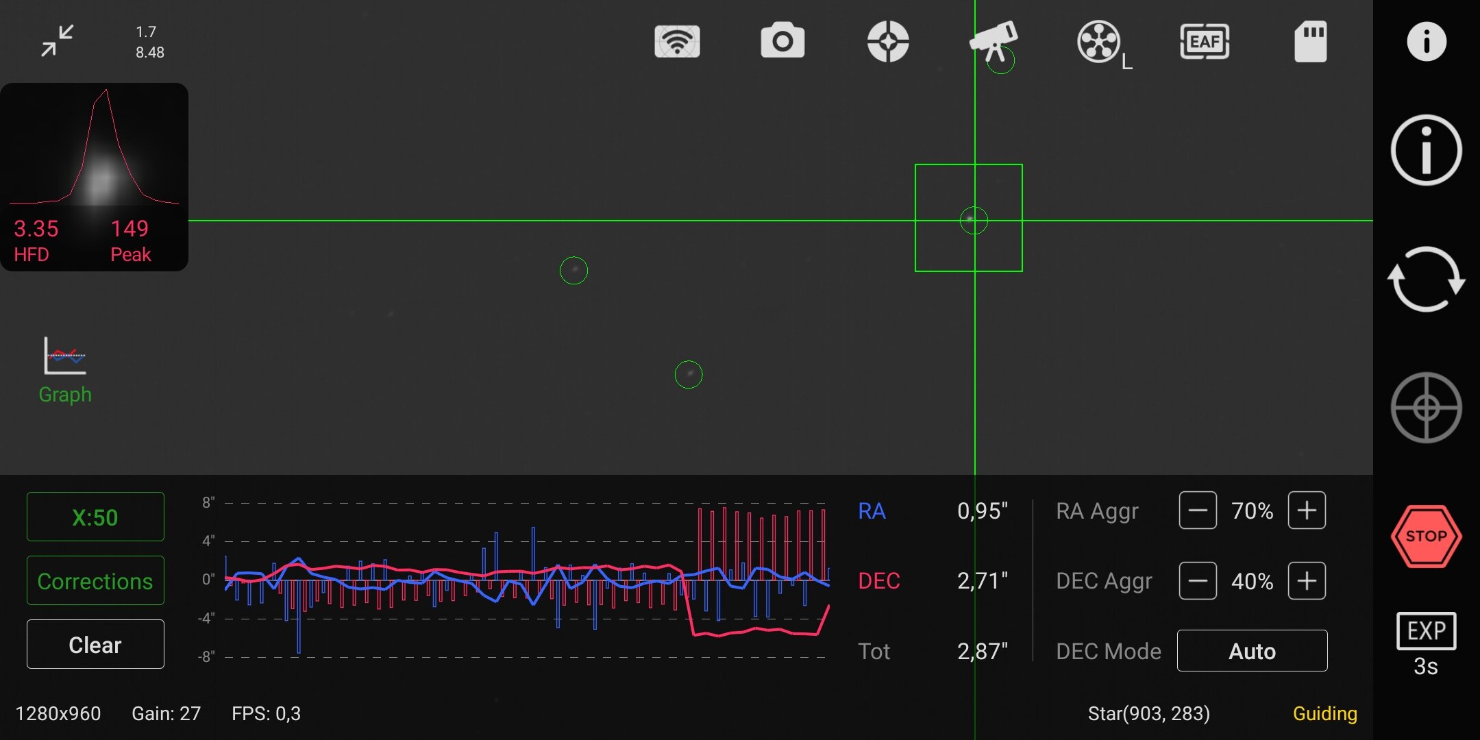 Donc la DEC commence à dériver lentement, l'ASIAIR envoie des ordres de corrections qui n'ont aucun effet (ou peut-être même un effet inverse) et au bout d'un temps assez long (plusieurs dizaines de sec voire plus) la monture réagit enfin par une correction brutale qui va évidemment trop loin. Cela arrive soit spontanément, soit parfois après un dithering.