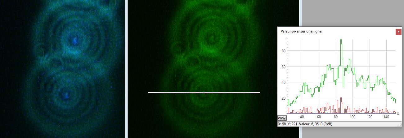 lyl Posté 5 novembre 2021 Posté 5 novembre 2021 (modifié) Les petits réfracteurs peuvent être ajustés en réglant l'espacement entre les lentilles. Les stars tests on peut les réaliser facilement à fort grossissement sur des étoiles blanches comme Vega (blanche par rapport à notre soleil jaune) Plage couleur. Examinez l'intensité entre 0.7um et 0.4 um (700-400nm) Tout d'abord d'ou viennent les conventions de réglage. A ) la sensibilité de l'oeil humain (deux modes : le mode rouge est celui de la perception colorée de jour) B ) les couleurs émises dans le ciel : principalement Oiii - Halpha Nebulium-120473a0.pdf Comment faire un star test à l'oculaire ? Prendre un oculaire de focale courte, en dessous de l'ouverture f/D de l'instrument, ce sera plus indiqué. Sur ces petits réfracteurs longs un oculaire bien corrigé de 10mm fait l'affaire Faite la mise au point sur une étoile brillante et plutôt blanche : Véga est presque tout le temps disponible dans le ciel de France. Raccourcir la distance du tube : intra-focale. Eloigner le tube extra-focale. La distance est courte : inférieure au millimètre, cela correspond à 1/30e de tour pour faire apparaître un anneau de diffraction Des star tests d'excellente qualité à optimal, classé suivant les réglages couleurs réglage photo Nikon / Grand réfracteur 108 Astro 80, mixte / Goto 80 planétaire Le violet autour de la Nikon n'est pas le violet de l'arc-en-ciel mais un mélange de rouge et de bleu : c'est un réglage F'C' (480-644) L'équilibrage est photographique. Le halo bleu sur la Goto et le point rose en extrafocal est typique d'un réglage planétaire type Oiii H-alpha, le bleu 480 ressort en intra et est déjà dispersé en extra (côté droit) On notera la blancheur en extra-focale proche du grand réfracteur 108 et de l'astro 80 et un réglage difficile à décrypter car très concentré assez typique des petits diamètres 60mm (c'est semblable a des astro-spezial de plus grande taille) Maintenant, un réglage imparfait. Il semble calé haut mais ... une tâche blanche est présente en extra-focale et un cercle extérieur jaune plus intense que le centre en intra-focale. C'est le signe d'un manque de piqué : sous-correction d'aberration sphérique. C'est là qu'il faut de l'explication théorique. Modifié 6 novembre 2021 par lyl 2 2