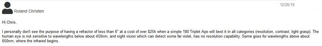 lyl Posté 25 décembre 2021 Auteur Posté 25 décembre 2021 (modifié) Quelques documents et commentaires. Star-Testing.pdf Remarques sur Test Etoiles des réfracteurs par Roland Christen Trouver des anneaux intérieurs/extérieurs identiques dans un achromat est normal. Cela est dû à la nature des aberrations chromatiques, qui concernent toutes les couleurs, sauf vert°, loin de la mise au point, où ils ne peuvent pas interférer avec le modèle de diffraction. Dans un objectif apo, le rouge, le jaune, le vert et le bleu sont tous très proches de la mise au point, mais pas parfaitement, pas exactement en même temps foyer identique°°. Ces couleurs ont tendance à interférer parfaitement avec le modèle de diffraction. Chaque objectif apo que j'ai jamais testé, même ceux qui ont été testés près de 1/20 d'onde PV, se montrent différents à l'intérieur et des schémas d'interférence extérieurs. C'est normal. Par contre, j'ai un 8" SCT qui montre parfaitement identique à l'intérieur par rapport à l'extérieur diagrammes de diffraction, mais ne teste que 1/4 d'onde°°°. Le vrai test d'une optique n'est pas tant de savoir comment le diagramme de diffraction regarde en dehors du foyer, plutôt, combien de déchets superflus flottent autour d'une étoile lorsqu'elle est nette. (dans mon 8" SCT il y a pas mal de ça). Dans un achromat avec une optique parfaite, il y a beaucoup de lumière bleue et rouge floue autour de n'importe quel objet. Plus brillant que l'objet soit, plus cette lumière interfère avec l'image. Ce qui sauve les achromats est un ensemble de filtres.+ Celà ne "répare" pas l'aberration chromatique, cela vous permet plutôt de voir l'image en une seule couleur en monochrome très fortement++. ================================================== ================== Si les anneaux extérieurs sont identiques de part et d'autre du foyer, il n'y a pas aberration sphérique importante. Ce que vous voyez dans la différence de contraste sur les bagues intérieures est due à des effets chromatiques. Utilisez un vert ou un jaune filtre (en fait, utilisez-les tous les deux en même temps) pour isoler le milieu du spectre visible. Essayez différents oculaires si le réfracteur est plus rapide que f10, vous pouvez voir différents effets de contraste. Plossls et certains Orthos ont tendance à ajouter une sous-correction à l'image. Lorsque vous trouvez l'oculaire qui donne le flou le plus égal images, utilisez-le dans votre observation. Astuce - oculaire multi-éléments comme les Naglers ont la meilleure correction sphérique pour les optiques rapides.+++ Roland Christen, ASTRO-PHYSICS ° vert, jaune ou orange suivant les calages. °° : causé par le sphérochromatisme. L'exemple minimal est pour la Vixen 90M ci-dessus qui montre un début d'interférences secondaires. Ce n'est pas aussi tranché pour les lunettes fluorites. (mais ce n'est pas le sujet ici) °°° : un SCT n'est pas parfait, les gros SCT à f/10 de Célestron montre des signes de chromatisme et sphérochromatisme, c'est ce qui limite leur taille à 14" et demande déjà des ajustements de mise au point en astrophotographie LRGB. + : très exagéré, Roland mentionne probablement les optiques à f/10-f/11. ++ : Roland est revenu là-dessus dans des textes plus récents en écrivant sur la bande spectrale utile. ----------------- Il n'a jamais été question pour aucun fabricant de réfracteurs achromatiques d'ériger le diamètre de 6" en standard. Zeiss s'est limité à 5" (60-130mm) pour ce qui est de la correction à f/15. La Zeiss E130, n'était même pas le modèle le plus prisé, La Zeiss E110 que je connais peut inscrire les spots de 481nm à 705nm dans 25um, elle n'est pas CeF mais plutôt Oiii (495.89nm)-Nii(658.4nm) raies "Nebulium" qu'elle inscrit dans 16um au centre champ. Elle maintient également un strehl >0.97 de 541 à 597nm quand on fait la mise au point dans le jaune. Et parmi les tentatives réussies récentes, il ne faut pas oublier la 4" f/12 d'Istar Optical calée FC (c'est la référence du Rutten & van Verooij). Mais bon, c'est normal Roland est de l'école américaine d'optique terrestre d'après la seconde guerre mondiale. Il prend exemple sur le calage F'C' terrestre. Ceci dit c'est de l'argumentation commerciale que de réduire les qualités des achromats en verre ordinaire à la largeur de leur plage de correction quand elle reste malgré tout plus large que celle de l'oeil. Sauf erreur, c'est ça qui compte quand on veut dire que l'instrument est bien fait pour l'usage en "découverte du ciel" par un particulier. 2019 : il y a 2 ans maintenant. En visuel, il descend la limite à 450nm. La vérité ? : la zone Z "indigo" en perception mésopique que tous les constructeurs ED utilisent sans vergogne depuis 40 ans sans le dire, alors qu'avant c'était clairement annoncé. Quand Roland parle de Fast 6"f9 ED doublet, il fait référence à la première série ED sortie par Meade en 6" : "The white elephant" Les optiques russes, plus honnête place la plage visuelle entre 440nm et 680nm sans chipoter plus que ça pour leur traitement interférométrique. C'est la marge 130% habituelle russstik 😊 +++ : ces deux dernières phrases sont justes et comme je disais plus haut : laisser les Nagler modernes dans le tiroir quand vous tester les optiques vintage. Modifié 26 décembre 2021 par lyl changement de référence, taille image 1
