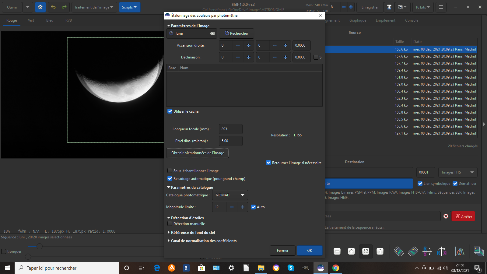 franck666 Posté 9 décembre 2021 Auteur Posté 9 décembre 2021 Il y a 1 heure, Fred_76 a dit : Je ne comprends pas, tu parlais de Voie Lactée ou de comète, et là tu montres une image de la Lune... Siril n'empile pas bien les photos prises sur trépied lorsqu'un paysage se trouve au premier plan. C'est le cas de la plupart des photos de Voie Lactée, d'où ma réponse (un peu courte je l'admets) initiale. S'il y a un paysage, il est préférable d'utiliser un logiciel adapté, comme Sequator. Si par contre il n'y a que des étoiles et pas de premier plan, Siril fonctionnera bien. Siril peut empiler les images avec une comète, mais le post traitement ne sera pas aisé, soit on aligne sur les étoiles et la comète sera floue, soit on aligne sur la comète et les étoiles fileront. Il faut donc jouer avec les masques dans un logiciel photo pour empiler les deux ce qui n'est pas aisé. Siril peut empiler les images planétaires, mais il n'est pas spécialisé dans ce type de traitement. Il est préférable d'utiliser des logiciels adaptés, comme Astrosurface, Autostakkert, Avistack ou Registax. Pour l'astrométrie, plus le champ est large, plus Siril peine à s'y retrouver. Le mieux est de faire l'astrométrie depuis un site spécialisé comme Nova Astrometry, et de saisir ensuite les valeurs retournées dans Siril. C'est plus lent mais ça marchera. oui excuse moi je pensais avoir des photos de voie lactée mais trop de temps entre chaque photo et hier soir ciel claire et lune donc j 'ai fais des photos de la lune pour essayer