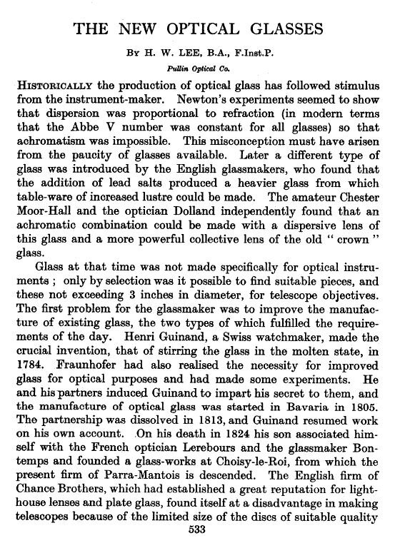 lyl Posté 23 janvier 2022 Auteur Posté 23 janvier 2022 (modifié) Document de 1880 sur les calculs d'un réfracteur de 7.5 pouces 100 pouces de focale. ChanceGlass-1880MNRAS__40__614S.pdf Les verres Chance Brothers La limitation de taille des verres flints ... Pas plus que 3" en 1824. (soit 76.2 mm) En 1848, pendant 6 ans (->1854) Georges Bontemps échange le secret du Flint (contre le Crown je suppose) Les deux verriers sont sur un pied d'égalité en 1854. On peut situer la naissance de verres stables de grandes dimensions avec le premier réfracteur de 18,5" d'Alvan G Clark en 1862. Chance Brothers was amongst the earliest glass works to carry out the cylinder process in Europe, and the company became known as "... the greatest glass manufacturer in Britain."In 1832, it made the first British cylinder blown sheet glass using French and Belgian workers. In 1839, a new process to grind the surfaces of plate glass was patented by James Timmins Chance. In 1848 under the supervision of Georges Bontemps, a French glassmaker from Choisy-le-Roi, who had purchased the secret of the stirrer after the deaths of Pierre Louis Guinand and Joseph von Fraunhofer, the pioneers of the manufacture of high-precision lenses for observatory telescopes, a new plant was set up to manufacture crown and flint glass for lighthouse optics, telescopes and cameras.Bontemps agreed to share the secret with Chance Brothers and stayed in England to collaborate with them for six years. Citation Chance Brothers a été l'une des premières verreries à réaliser le processus de cylindre en Europe, et l'entreprise est devenue connue comme "... le plus grand fabricant de verre de Grande-Bretagne". employant des travailleurs français et belges. En 1839, un nouveau procédé pour meuler les surfaces de verre plat a été breveté par James Timmins Chance. En 1848 sous la direction de Georges Bontemps, verrier français de Choisy-le-Roi, qui avait acheté le secret de l'agitateur après la mort de Pierre Louis Guinand et Joseph von Fraunhofer, les pionniers de la fabrication de lentilles de haute précision pour télescopes d'observatoire, une nouvelle usine a été créée pour fabriquer du verre de couronne et de silex pour l'optique des phares, des télescopes et des caméras. Bontemps accepte de partager le secret avec Chance Brothers et reste en Angleterre pour collaborer avec eux pendant six ans. Modifié 8 février 2022 par lyl 1