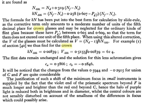 lyl Posté 13 janvier 2022 Posté 13 janvier 2022 (modifié) A relire les anciens, dans leur contexte technique de l'époque, on comprend mieux leurs choix, parfois alambiqués. La théorisation du chromatisme par AE Conrady. Cela se situe grosso-modo 25ans après la publication du recueil technique des ateliers allemands vers 1903 (publication dirigée par le Dr M von Rohr, avec participation de S.Czapski, A Konig, tout ça avec la bienveillance de C.Zeiss, O.Schott et E.Abbe) J'ai récupéré des informations historique provenant du livre d'A.E Conrady rédigée en 1929, rapportée par Rudolph Kingslake (Eastman Kodak) Voice une comparaison des dispersions chromatiques des achromats de la fin du 19eme siècle au début du 20eme siècle Le verre Hard Crown 1203 de la firme Chance (liée à la famille Feil-Mantois) a été réutilisé et recomposé chez Schott en Balk3, ce verre très célèbre est maintenant disparu. En rouge : Siegfried Czapski en a fait la fameuse formule Zeiss E littrow fabriquée par les ateliers berlinois et mise en tube chez Zeiss au début de la société. Une fameuse planétaire extrêment piquée car très facile à contrôler. (3 courbures identiques et face arrière plate : le rêve de l'opticien). Schott & Genossen existe mais n'est pas leader du marché des verres. (cité en dernier) Quand la formulation de la condition des sinus pu être découverte par Abbe on a pu en faire des aplanats FC. En bleu : la formulation en aplanat (pas de coma) combinaison différente avec le verre Dense Flint de la maison Chance. (D332 chez Parra-Mantois et F13 chez Schott). C'est un équivalent de Balk3+F13 chez Schott, plus cher. En vert : après la guerre ce verre n'est pas présent au Japon, les objectifs sont réalisés avec la combinaison de verre la moins couteuse : équivalente au BK7-F2. Les achromats perdent 10% en dispersion bleu-rouge après la guerre de 1940-45. --------------- Sur la neutralité couleur du calage des instruments. Voici également un partie du texte que Danjon et Couder reprendra, expliquera et complètera dans Lunettes & Téléscopes en 1935. Conrady fit allusion à l'épaisseur des verres des grand instruments de plus de 50cm qui filtrent un peu de violet et de bleu. Il est bien fait référence à ce que le pouvoir résolvant peu être impacté par la présence de couleur parasite (côté bleu comme côté rouge) Un autre fondamental, la provenance du CA-Ratio, qui date l'époque de John Dollond plus d'un siècle avant. -> Le critère de Conrady que l'on considère suffisant pour exploiter au maximum un instrument, à l'époque ou il l'a formulée. Comme on le constate, il n'est pas basé sur l'association F2-BK7 qui est 100% germanique en 1929 et encore en 1935 (D&C) mais sur la référence des verres astronomiques de l'époque. Le borosilicate est un second choix. Je dois dire que c'est une demi-surprise pour moi de constater qu'en 1935, ce n'était pas les allemands qui était leader sur les instruments astronomiques. La sortie du Zeiss AS par August Sonnenfeld en remplacement de l'objectif A (après l'abandon du verre BALK3-BALK2 pour le BK7) se situe vers 1926. Ce sont des dates pivots sur l'essor de l'optique allemande. L'objectif pivot représentant la norme de l'achromatisme est l'achromat de 3" f15 (76mm/1143mm) en 1203 Hard Crown + 360 Dense Flint de chez Chance, souvent décliné en 76/1200 au début des lunettes japonaises, sans doute pour raison de marge technique pour le calage et de moins bonne qualité de la combinaison optique. (Résidu chromatique un peu moins bon : 2.7 au lieu de 2.35 pour une 80-1200) Ca plaisantait pas à l'époque ! AE Conrady place le résidu chromatique proche de 2.3 pour la parfaite correction avec la référence d'une 3", mais on gratte peut-être un peu trop sur les chiffres... vu qu'une 130mm f15 ça laisse une impression très légère de chromatisme, on est presque au double. AE Conrady explique aussi un subterfuge pour masquer le violet et le bleu dans sa formule de calcul algébrique des petits instruments : Citation The justification of such shift of the minimum focus... Pour les instruments terrestres, on aboutira à la généralisation du calcul et l'utilisation d'une autre méthode de contrôle quelques années plus tard chez Zeiss : les raies cadmium 480 et 644nm plutôt que les raies hydrogène. Dans le paragraphe du livre, il expose et synthétise l'état de l'art expérimental des réglages de microscopie, d'objectif de recherche, d'astronomie... Ci-dessous Conrady expose sa méthode de correction supplémentaire qui prend en compte la plage g'f (434-486nm), dite "bleue" et début du violet. Sa méthode translate la correction vers les couleurs chaudes (surcorrection) ou vers le bleu (sous-correction) Danjon et Couder reprendrons cet exemple de surcorrection (sans donner de méthode de calcul plutôt indigeste) pour l'astronomie §37 page 108 et §38 page 111 de lunettes & télescopes : Danjon Couder P107-114.pdf En résumant, meilleure est la tenue dans le bleu : plus on peut caler bas. Il faudrait que je le fasse pour montrer le décalage de surcorrection par rapport à 0.5555 um mais on verra plus tard si les questions se présentent. (voir plus bas) ---------------------------- Des commentaires de 1914 par Stanley sur les verres optiques, pas très gentil pour Schott en page 17. -------------------- Annexe après calculs selon l'équation de Conrady, le réglage optimal du minima focal, pour une restitution de la blancheur de l'image, pour des petits réfracteurs (<<50cm) réalisé en N-BK7-F2 se fait avec ces valeurs : vNBK7-535=65.383 , vF2-535=36.595. On l'obtient à 548.5nm, soit une sous-correction qui correspond (à l'épaisseur du trait) au réglage Zeiss F'C' "on foot" pour l'utilisation terrestre. Il y a des variations mineures suivant les verres mais grosso modo, Schott fourni de nos jours un des meilleurs verres F2. Attention, ce n'est pas le N-F2 qui est la version modern