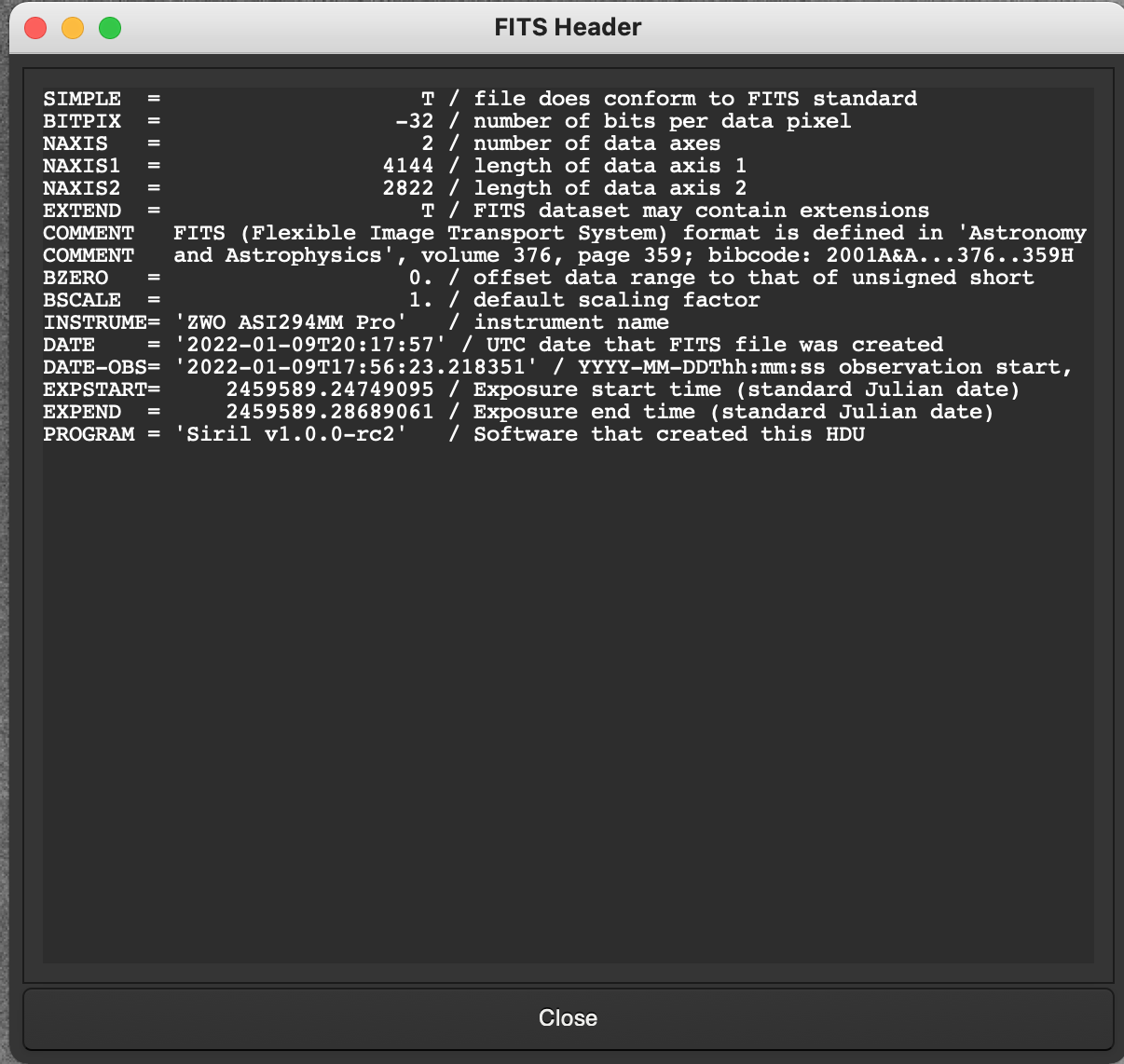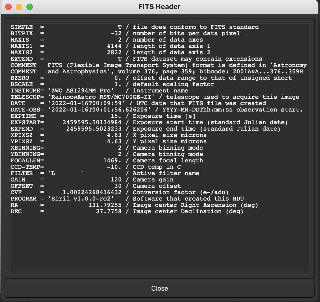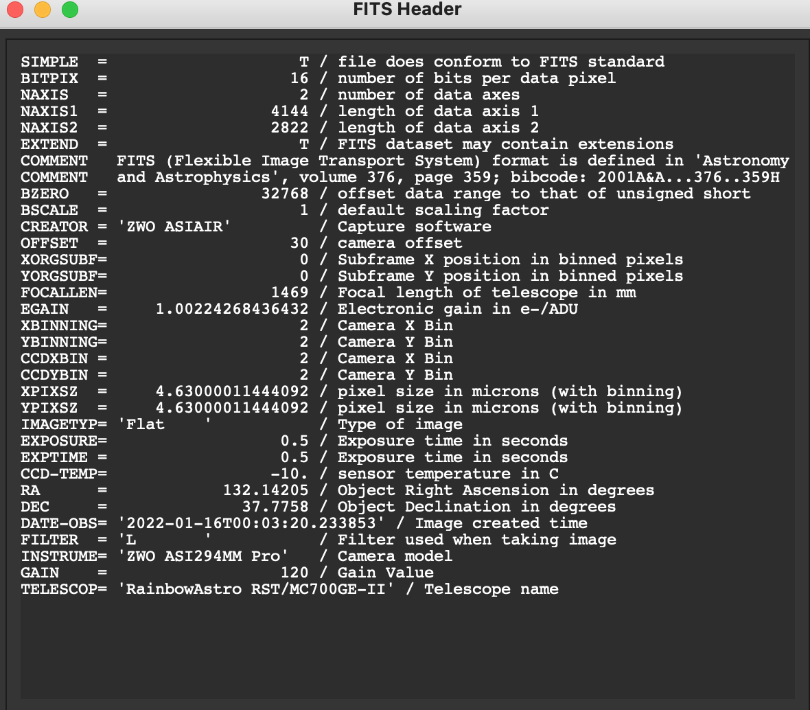 clouzot Posté 18 janvier 2022 Auteur Posté 18 janvier 2022 Sinon, la boîte rouge rajoute un TAG aux masters qu’elle crée : STACKCNT, qui contient le nombre de subs empilés. Aucune idée de si c’est plus ou moins standard. Citation SIMPLE = T / file does conform to FITS standard BITPIX = 16 / number of bits per data pixel NAXIS = 2 / number of data axes NAXIS1 = 4144 / length of data axis 1 NAXIS2 = 2822 / length of data axis 2 EXTEND = T / FITS dataset may contain extensions COMMENT FITS (Flexible Image Transport System) format is defined in 'Astronomy COMMENT and Astrophysics', volume 376, page 359; bibcode: 2001A&A...376..359H BZERO = 32768 / offset data range to that of unsigned short BSCALE = 1 / default scaling factor CREATOR = 'ZWO ASIAIR' / Capture software OFFSET = 30 / camera offset XORGSUBF= 0 / Subframe X position in binned pixels YORGSUBF= 0 / Subframe Y position in binned pixels FOCALLEN= 1229 / Focal length of telescope in mm EGAIN = 1.00224268436432 / Electronic gain in e-/ADU XBINNING= 2 / Camera X Bin YBINNING= 2 / Camera Y Bin CCDXBIN = 2 / Camera X Bin CCDYBIN = 2 / Camera Y Bin XPIXSZ = 4.63000011444092 / pixel size in microns (with binning) YPIXSZ = 4.63000011444092 / pixel size in microns (with binning) IMAGETYP= 'Dark ' / Type of image STACKCNT= 20 / Stack frames EXPOSURE= 10. / Exposure time in seconds EXPTIME = 10. / Exposure time in seconds CCD-TEMP= -10. / sensor temperature in C DATE-OBS= '2021-08-13T14:33:01.728' / Image created time INSTRUME= 'ZWO ASI294MM Pro' / Camera model GAIN = 120 / Gain Value