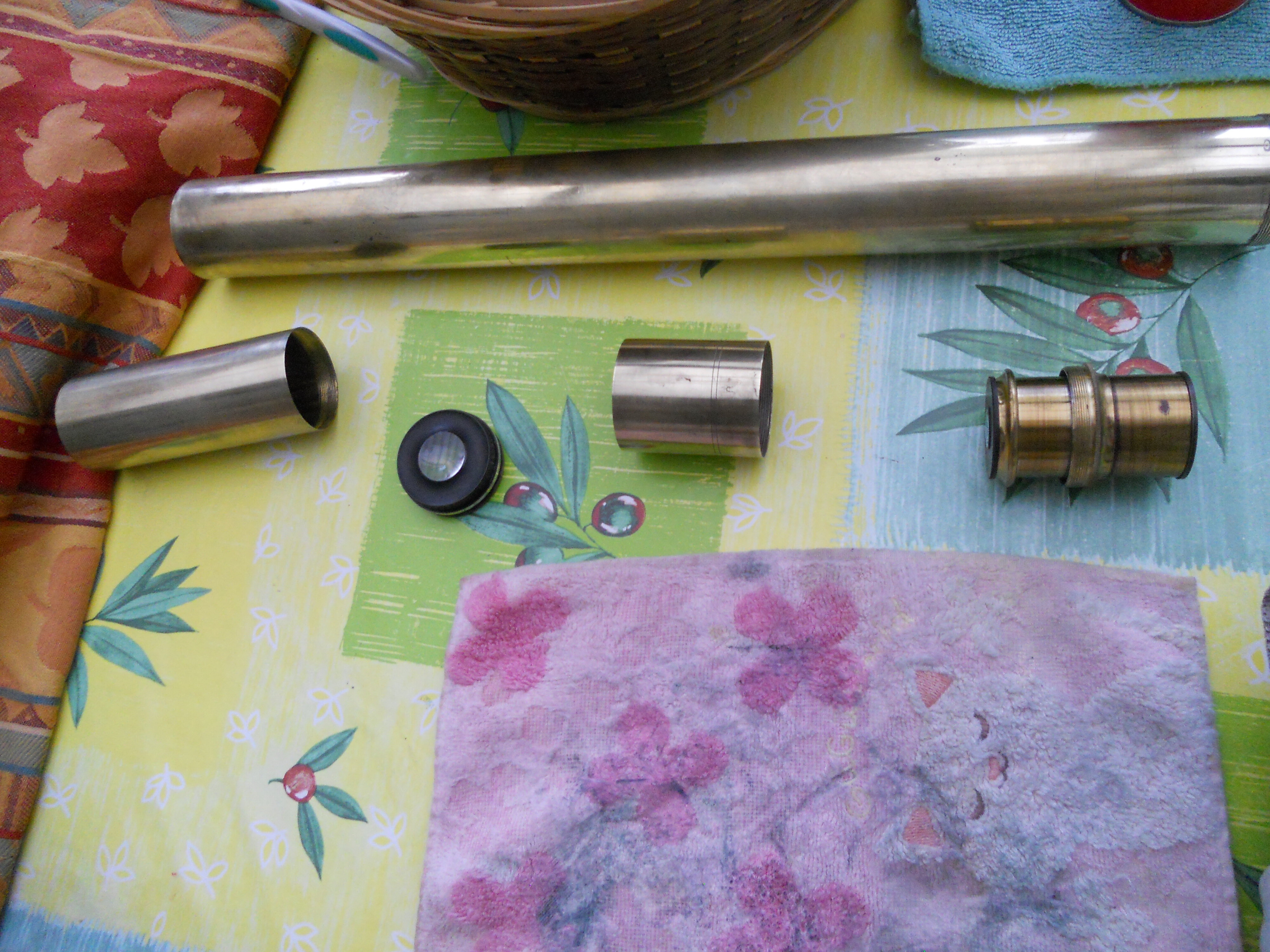 Sa y ait j'ai enfin réussi à extraire l'oculaire terrestre de son tube où il était coincé, je suis impressionné par la qualité d'une part de la pièce et d'autre part par la transparence cristalline des lentilles malgré un siècle et des brouettes. Vraiment un travail d'orfèvrerie pour les tubes et d'opticien pour les lentilles.
