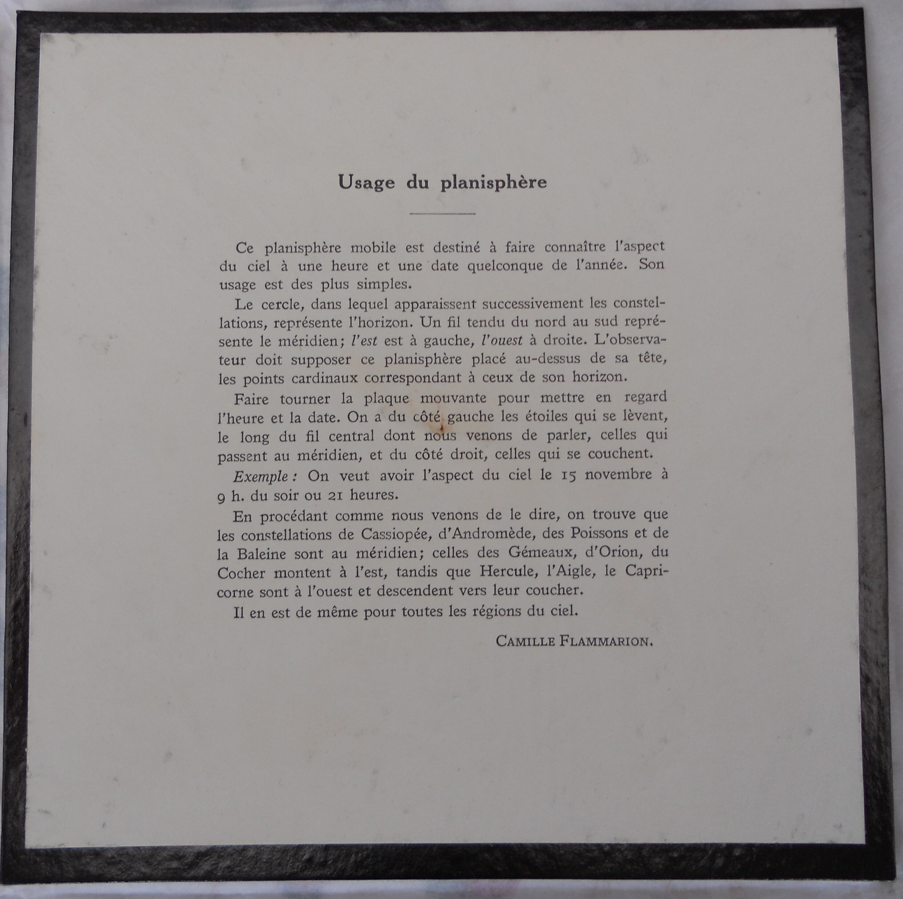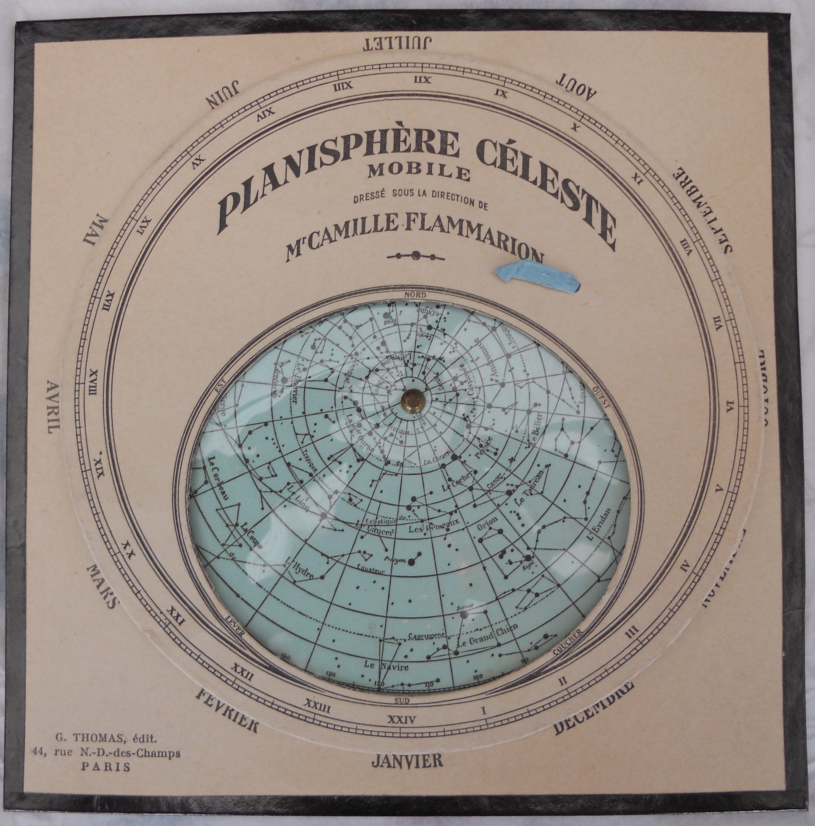 JonathanGrégoire Posté 30 janvier 2022 Posté 30 janvier 2022 Je présente ici pour la documentation diverse, une carte céleste tournante qui fut élaborée sous la direction de Camille Flammarion, le premier exemplaire semble avoir été élaboré vers 1900 et commercialisé autour de cette date. Elle fut semble-t-il diffusée jusqu'avant guerre ou elle connue un certain succès compte-tenu du nombre d'exemplaires édités à l'époque. Puis à partir de 1950 elle semble avoir été un temps publiée de nouveau avec la mise à jour de l'Astronomie Populaire en 1955 sous la direction de Gabrielle Camille Flammarion et d'André Danjon. Cette carte est l'ancêtre des Miniciel et autre Planiciel, et de toutes les cartes céleste ultérieures destinée aux Astrams ou au public désireux de s'y retrouver dans la géographie céleste. Les constellations de l'hémisphère boréal sont présentes, mais les étoiles ne comportent pas leurs lettres grecques. La carte était protégée de l'humidité par une protection plastique dans les dernières versions. 3