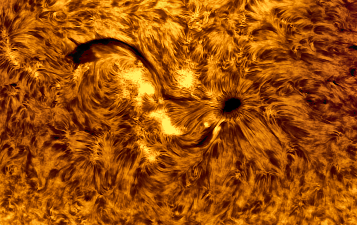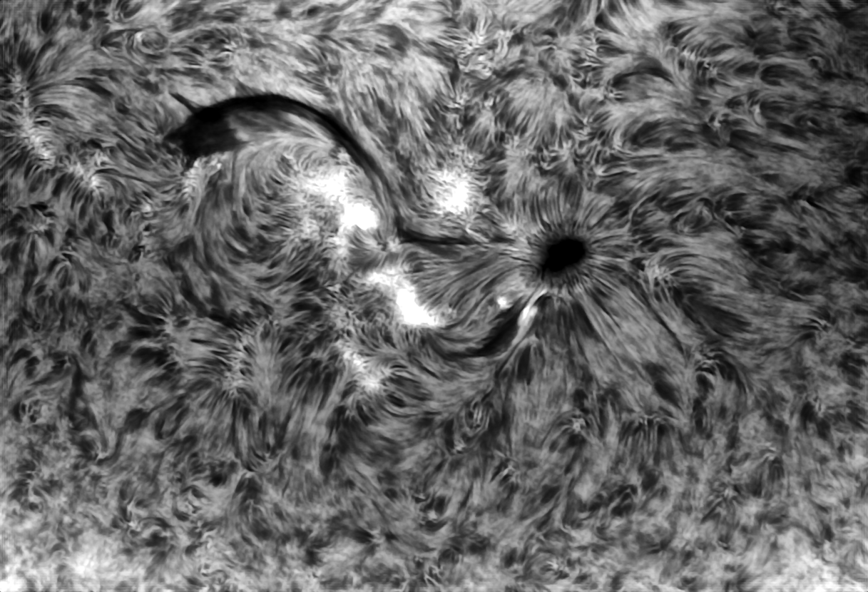 Soleil Magnifique filament s'elevant d'une tache solaire lunette 150 mm halpha