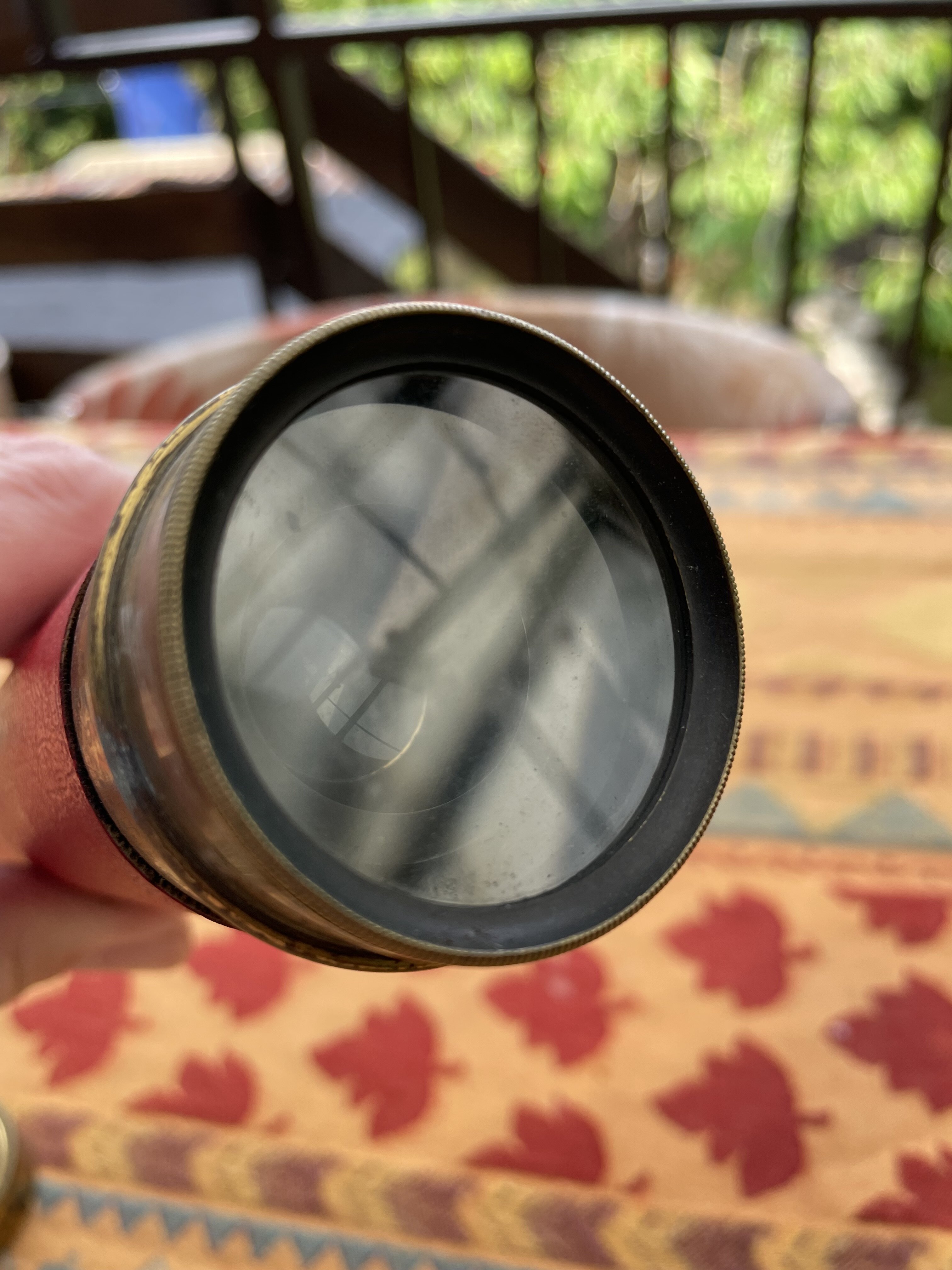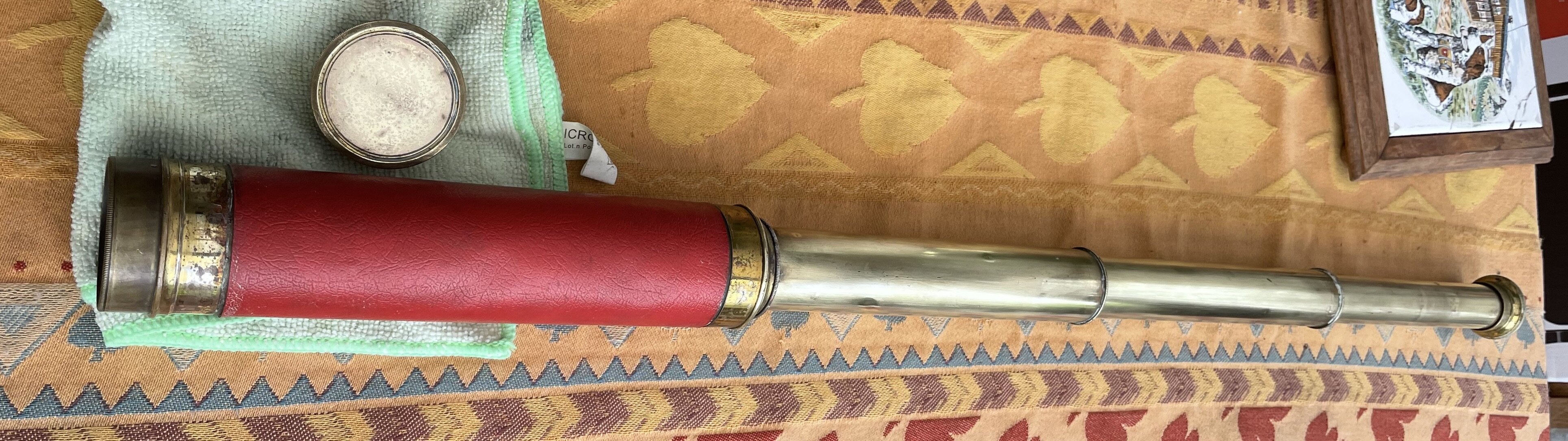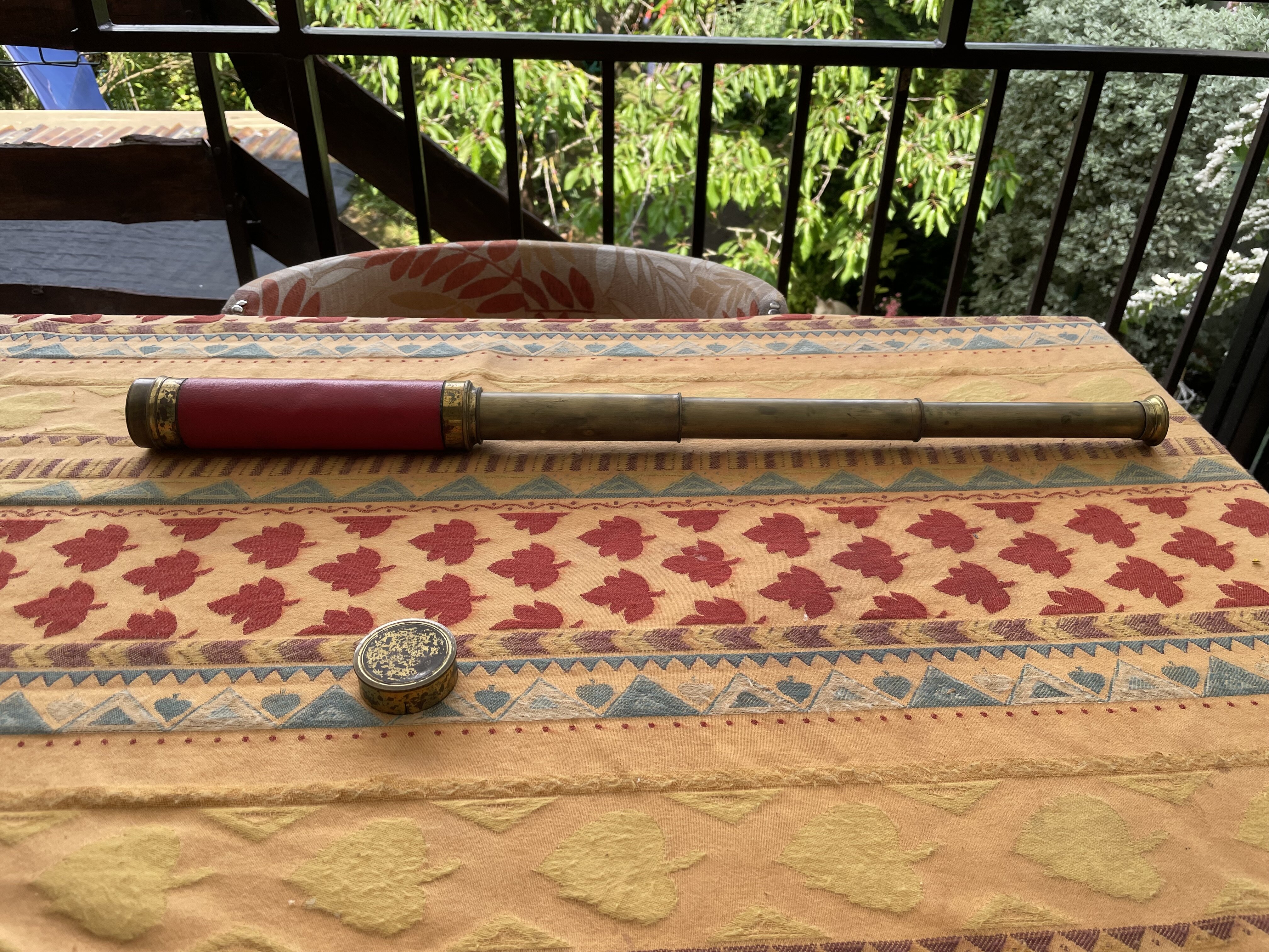JonathanGrégoire Posté 20 mai 2022 Posté 20 mai 2022 (modifié) Je viens d'acheter cette petite longue vue terrestre, présentée par le vendeur comme dite de "marine", estimée fin XIXe siècle. Diamètre objectif : 50 mm, 3 tirages, longueur 74 mm. "L'habit" rouge est dans un cuir semblable à celui des anciens scribans, et sous cette présentation rouge, le corps principal de la longue vue me recouvert de bois, mais pas certain à 100%. Je l'ai testée, optique correcte, par contre aucune idée sur le fabriquant, il n'y a pas de nom apparent, et elle me semble plus puissante en grossissement qu'une paire de jumelle 7 x 50. L'image obtenue est lumineuse et bien nette. Testée sur arbres dans le lointain, avions de ligne, et oiseaux. Le protège oculaire est semblable à celui de ma grande Lulu de 120 dans sa fabrication, avec un obturateur identique. Si quelqu'un a une idée de son origine ? Fabrication française ? anglaise ? autre ? Astronomiquement vôtre Jonathan Modifié 20 mai 2022 par JonathanGrégoire