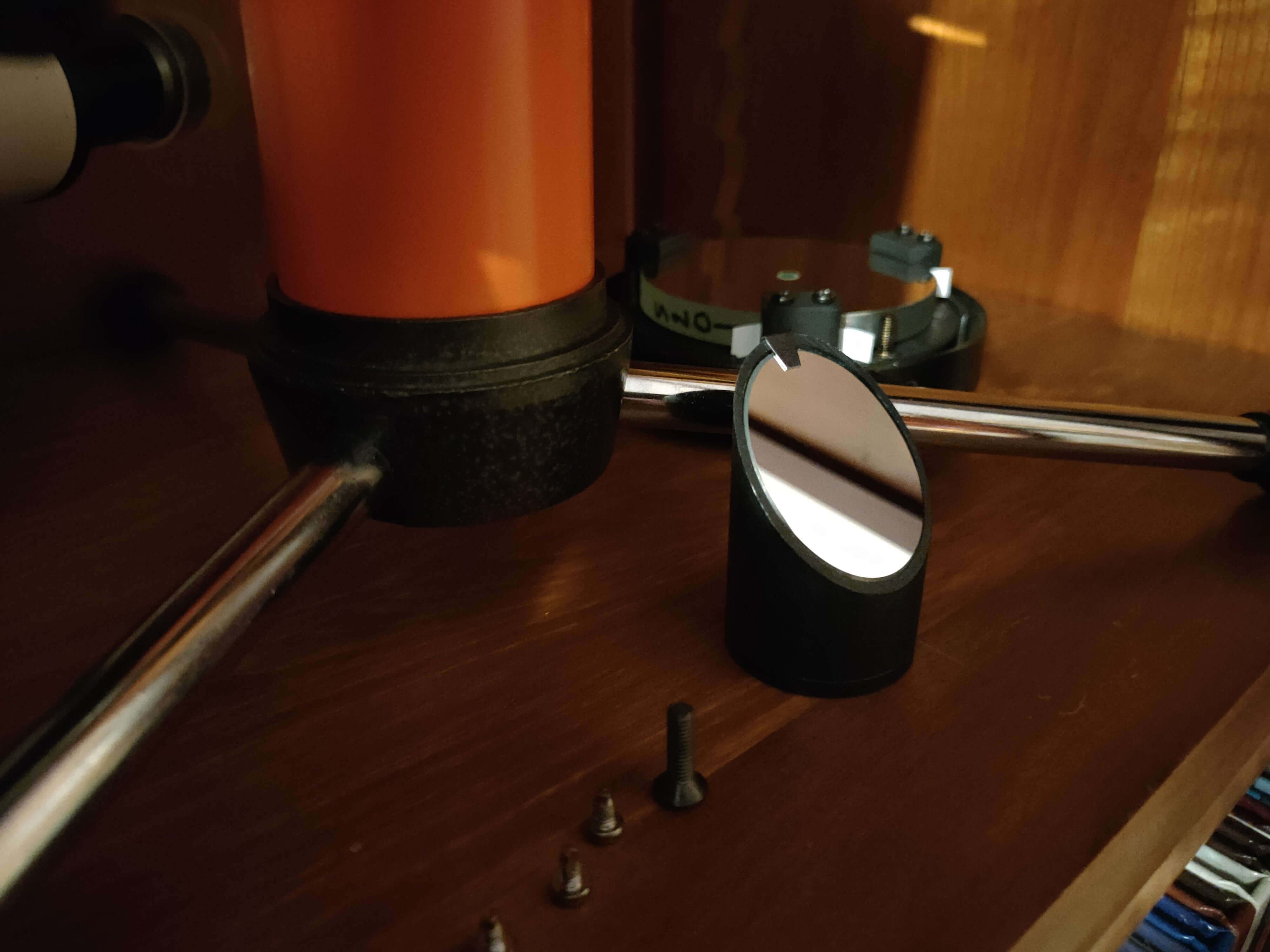 Jorris Posté 13 juillet 2022 Posté 13 juillet 2022 (modifié) J'ai récupéré il y a quelques temps un petit, minuscule, Vixen Halley multi r 80s. C'est tout mignon dit donc. Je me souviens de la très bonne image du petit Tal Alcor 65mm. A quoi dois-je m'attendre dans le petit Vixen, ci certains on utilisé ? ... Mais avant, petite "restauration" petite, car il est propre mais nécessite quelques retouches. Le Miroir primaire. La plaque de collimation avait besoin d'un bon redressage C'est mieux après. Le miroir est fixée directement dessus par 3 fixations. Les visses de blocages et reglages agissent sur cette plaque, le miroir fixé dessus, suit le mouvement. Après Le miroir primaire, apres nettoyage. Nickel Un peu marqué sur l'emplacement des fixations, mais sinon super propre. Re fixé sur la plaque. Ajout de 2 petites cales en papier, pour éviter le jeux diamètral. Le miroir tourne facilement sur lui même une fois serré correctement. Il était fort bloqué avant ça. Ajout d'un centre. Fixé a nouveau sur son support. Changement de visses, laiton = blocage, btr = reglage. Ca sera mieux que les petites visses cruciforme. Les btr se tournent facilement au doigt. Noircissent du laiton a l'intérieur Modifié 13 juillet 2022 par Jorris 1
