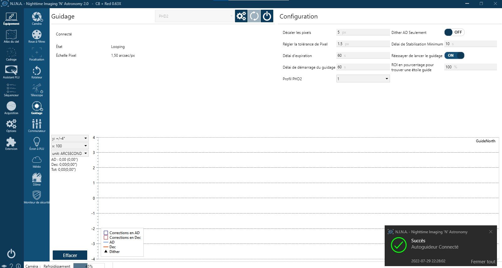 Une fois la monture connectée à NINA, je démarre PHD2