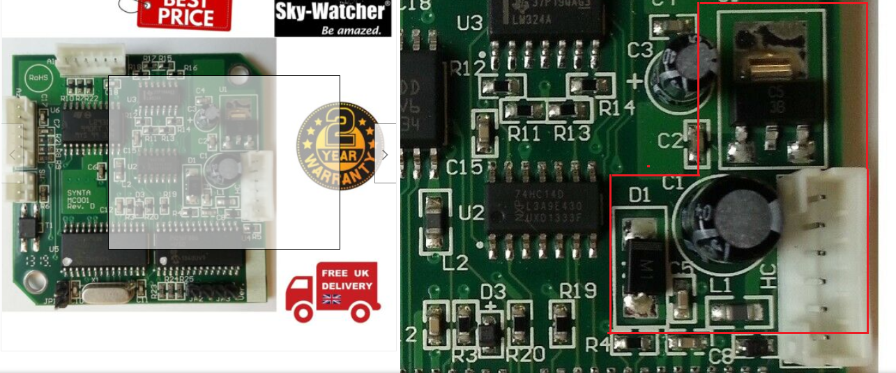 Voici une carte mère de monture AZ Skywatcher. Ce qui entouré en rouge ressemble bigrement à un étage alimentation. Ce qui m'interroge est la présence d'une diode de puissance D1. Quel est son rôle sur une telle carte.