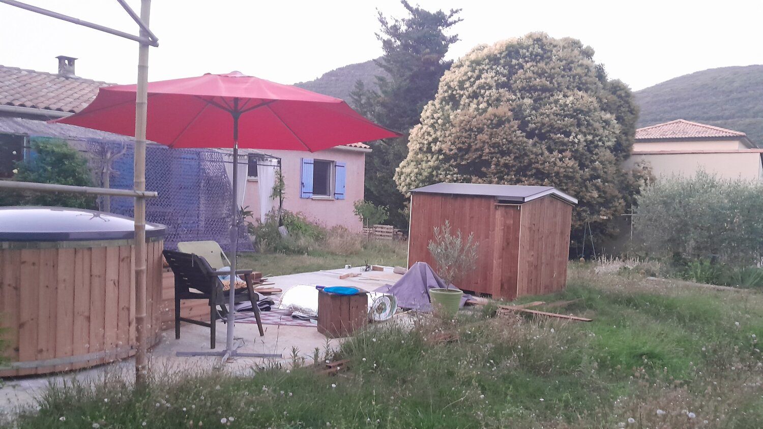 @morbli la longueur totale couverte est d environ 1m80, la largeur hors tout 1,60, en hauteur 1,50m au faitage dont les 8cm du bas seront masqués par la terrasse bois à venir.