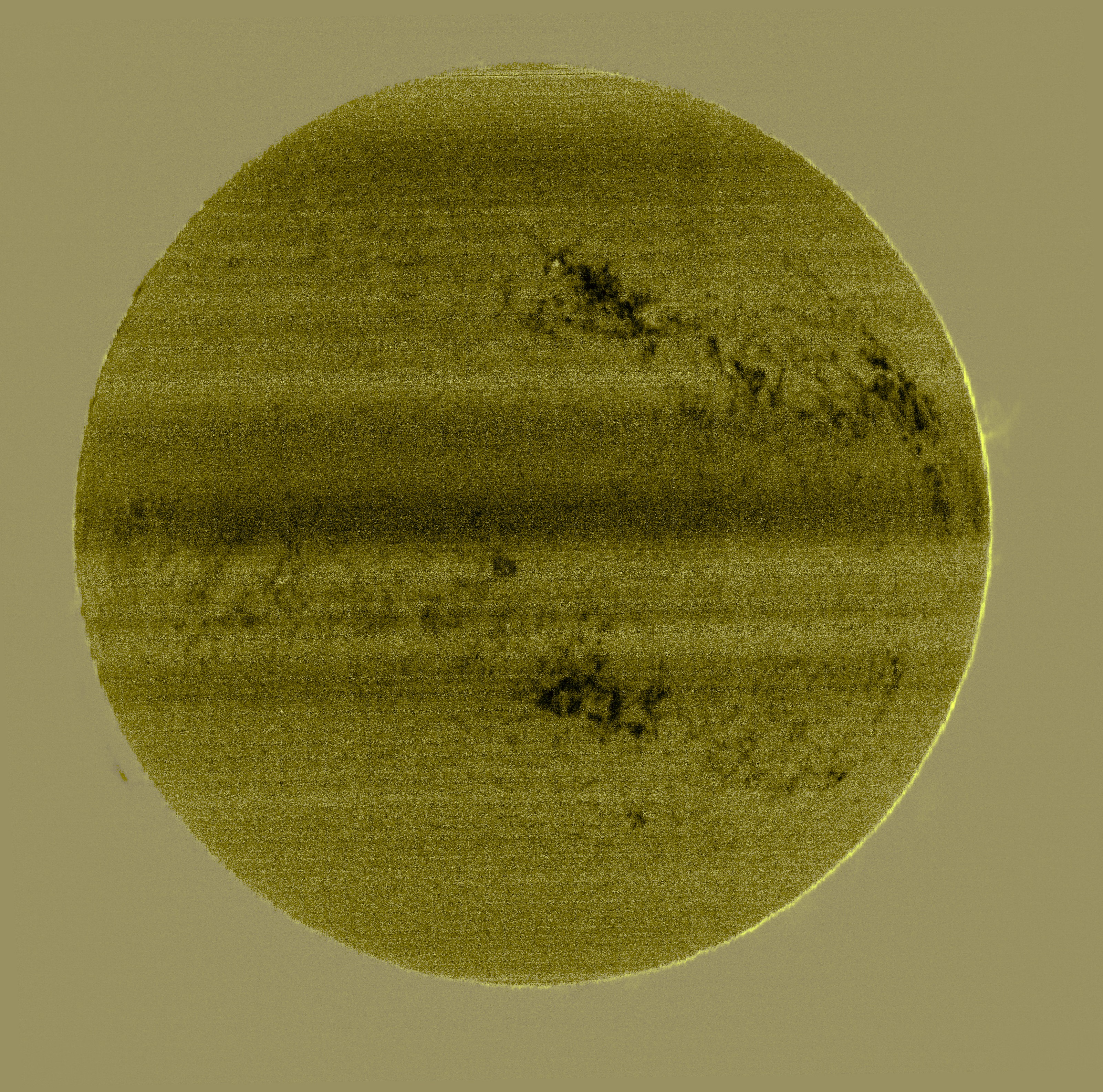 Une petite expérience hier en dépit du vent fort (pffff) pour tenter d'imager l'astre solaire dans une configuration compliquée par l'extrême discrétion de la raie ciblée : la raie jaune de l’hélium (He I) à la longueur d’onde de 5875,65 A, dite raie D3 !!