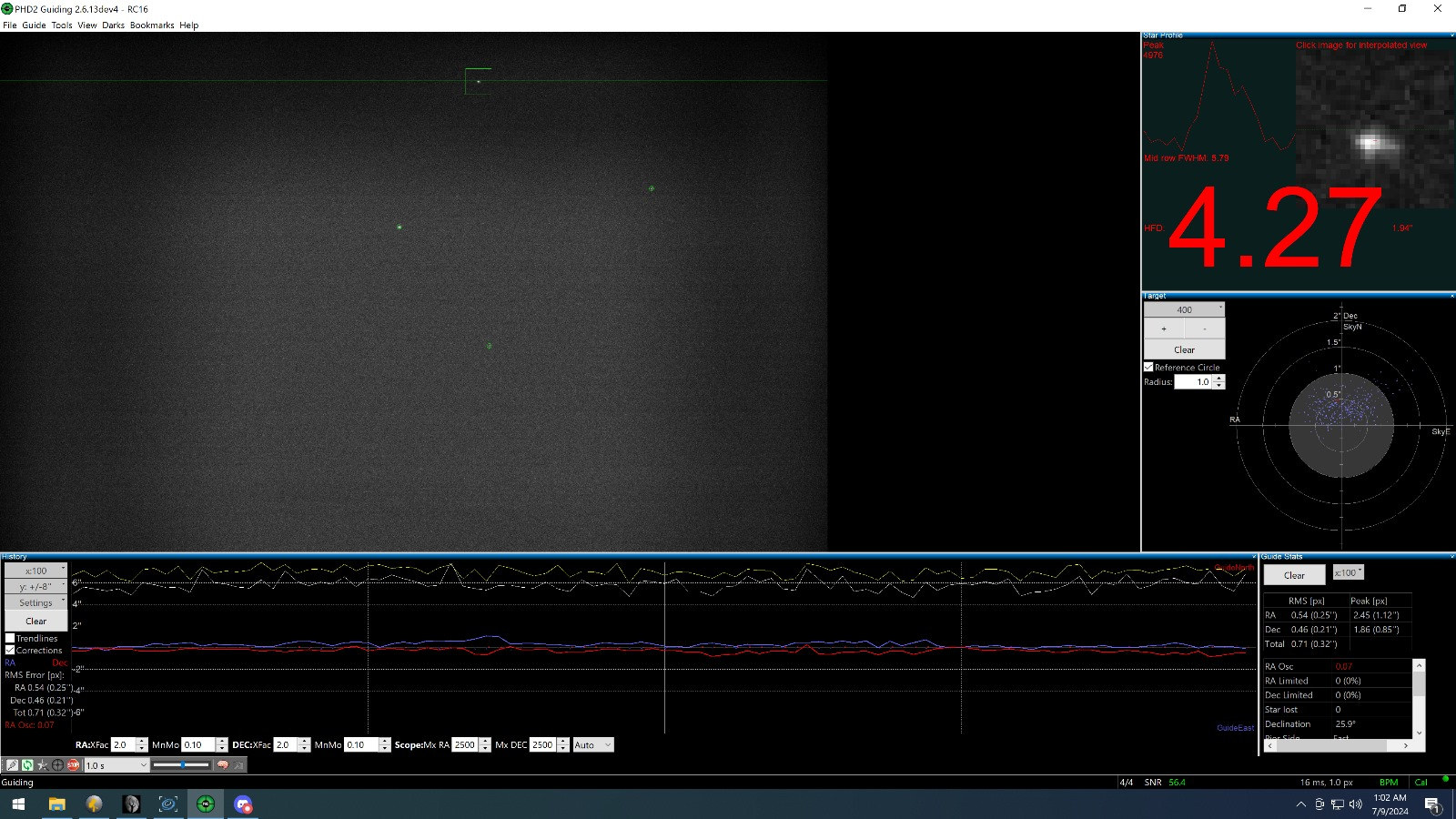 (Pour la EQ6r, PPEC nickel, 0.6" sur 5h30 de guidage hier, avec passages à 0.45")