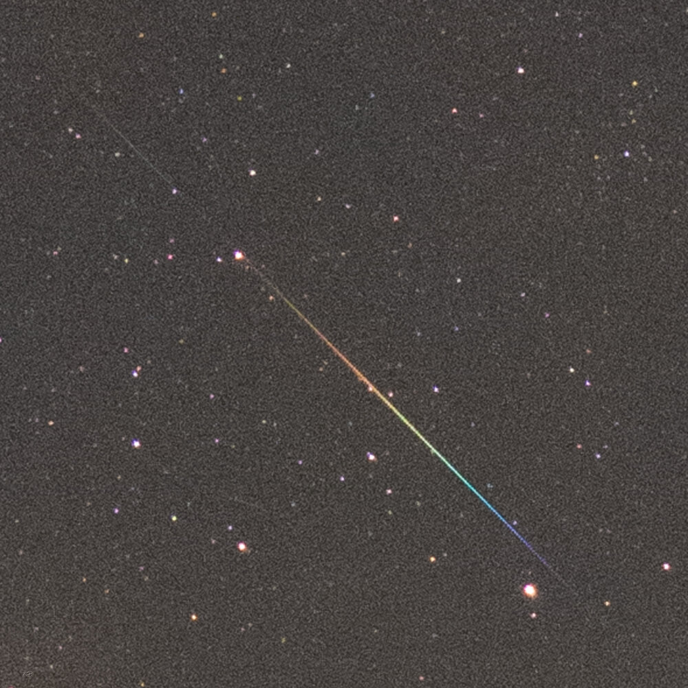 Il n'y en a quasiment plus, il est plus probable qu'il s'agisse du flash d'un satellite classique (on en voit de temps en temps par hasard) toutefois ça n'explique pas les couleurs arc en ciel