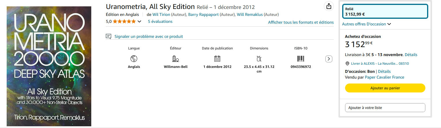 Ma dernière acquisition... Je cherchais un bel atlas grand format à utiliser à la maison, et je suis tombé sur un superbe Sky Atlas J2000 de Wil Tirion en 26 planches, édition de 1987, dans un état neuf jamais relié.