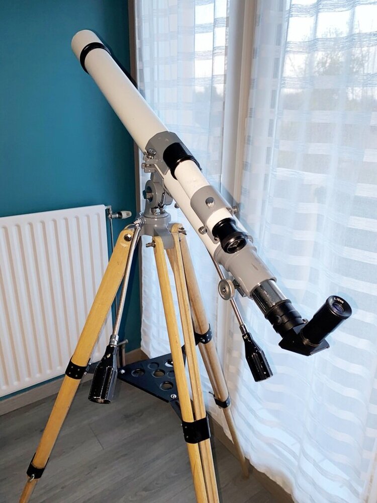 sqfab Posté 9 février 2024 Posté 9 février 2024 (modifié) Bonjour, J'ai trouvé sur un site de vente en ligne, bien connu, l'été dernier, une lunette de 60/800. Après quelques recherches il s'avère que c'est le modèle "Jupiter SYW 60/800" présent dans le catalogue Perl durant les années 70/80. Le modèle que j'ai acquis a encore son mode d'emploi édité par les établissements Cerf de Paris, probablement du milieu des années 70. A noter que ce modèle est un rebadgage Perl du modèle d'origine Carton CA60. Optiquement le tube est en bon état, objectif très propre sans rayures ni champignons. Le chercheur a bien vécu, le réticule n'existe plus, mais ses optiques sont propres aussi. Esthétiquement les deux tubes présentent des éclats de peinture blanches, surtout sur le chercheur mais cela ne nuit aucunement à leur bon fonctionnement. A noter que l'étiquette sur le PO a disparu. Le PO est fonctionnel, sans jeu mais un peu dur (graisse ayant bien vécue). Seul était présent comme accessoire une barlow en deux parties, bien usée, mais après nettoyage et remontage elle fera le travail, si nécessaire. La monture azimutale est en très bon état, il manque juste un flexible long, que j'ai trouvé sur le net plus tard. La lunette était dans une caisse en bois sans aucune protection. J'ai décidé de nettoyer, et réhabiliter cette superbe lunette, à priori de bonne facture si j'en crois les avis sur ce site et d'autres sites outre manche et outre atlantique. Esthétiquement je n'ai pas décidé de repeindre les deux tubes, autant par désir de conserver un aspect vintage que par mon incompétence à refaire deux tubes parfaits. Sur le tube principal, l'objectif a été nettoyé correctement, le tube aussi bien sur, sans oublier le revêtement noir intérieur. Le porte oculaire a été démonté, nettoyé et regraissé et il fonctionne maintenant onctueusement et sans jeu. J'y ai monté à la place du PO d'origine en 24,5mm, un PO de 31,75mm avec un adaptateur 24,5mm. La monture a été aussi démontée, nettoyée, regraissée et complétée par le deuxième flexible long manquant. Le trépied a été nettoyé, dégraissé, poncé et verni en deux couches. Toutes ses ferrures ont été poncées et repeintes, le tout remonté avec une nouvelle visserie. Pour la caisse, j'ai transmis le tout à un ami qui m'a fait une recomposition sympathique du rangement de la lunette dans cette caisse. Il me reste maintenant à la tester sur le ciel avec les oculaires qui vont bien. J'ai quelques oculaires de l'époque en 24,5mm à lui adjoindre : OR6mm Tani, OR9mm Vixen, Kellner 18 et 30 Celestron. Plus bien sur des oculaires plus "modernes", Clavé12mm, Taka LE 7,5mm et d'autres. Je posterai des photos de la lunette de pied et de cap plus tard. En attendant les photos de la caisse telle que je l'ai récupéré cette semaine. Pascal Modifié 9 février 2024 par sqfab 2