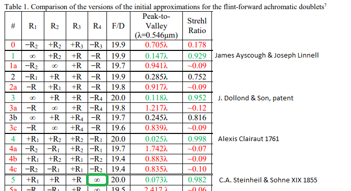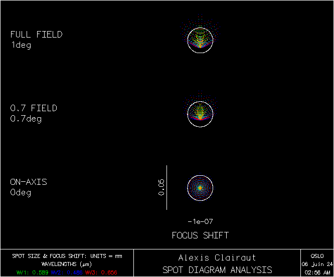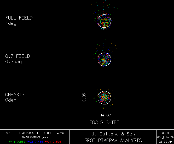 lyl Posté 17 juin 2024 Auteur Posté 17 juin 2024 (modifié) D'après WF Stanley, inventeur et fabricant d'instrument en 1890 dans son traité d'optique. Les calculs qui suivent utilisent ces verres cités dans le traité. Années 1890 : petites lunettes : +/- 10m précis à 1000m, destiné à l'arpentage (alignement de poteaux) 30.5mm de diamètre, ~300 de focal, construction littrow. Grossissement probablement x10 à x12. Lunette de 3" (76.2mm et f/15, 1143mm de focale), grande lunette de marine sur pied. Les oculaires sont assez long en focale de 25mm à 40mm En doublet air-spaced, type Fraunhöfer (commence à se diffuser), l'angle est plus que doublé mais surtout pleinement corrigé avec un oculaire standard. Sur 18 mètres à 1km on voit bien des détails (exemple : un bateau). Les deux derniers sont intéressants pour la transmission par sémaphore Chappe (1793) Première transmission en 1792 : Paris vers Lille Le premier symbole d'un message pour Lille traversa 193 km à travers 15 stations en seulement 9 minutes soit environ 13km entre station. On comprends mieux pourquoi les jumelles seront popularisées plus tard (manque de correction grand angle / faible grossissement) ------------------ En annexe : les verres d'époque en Angleterre et Allemagne. Chez Schott à Jena : les équivalents du Hard Crown et Dense Flint. Les allemands fonctionnaient déjà avec les dispersions partielles et le nombre d'Abbe. O.1726 Silicate Crown C:1.51528, D:1.51787, e:1.52005, F:1.52408,G':1.52909 O.102 Ordinary Silicate Flint C:1.61676, D:1.62164, e:1.62585, F:1.63392, G':1.64437 Modifié 20 juin 2024 par lyl 2