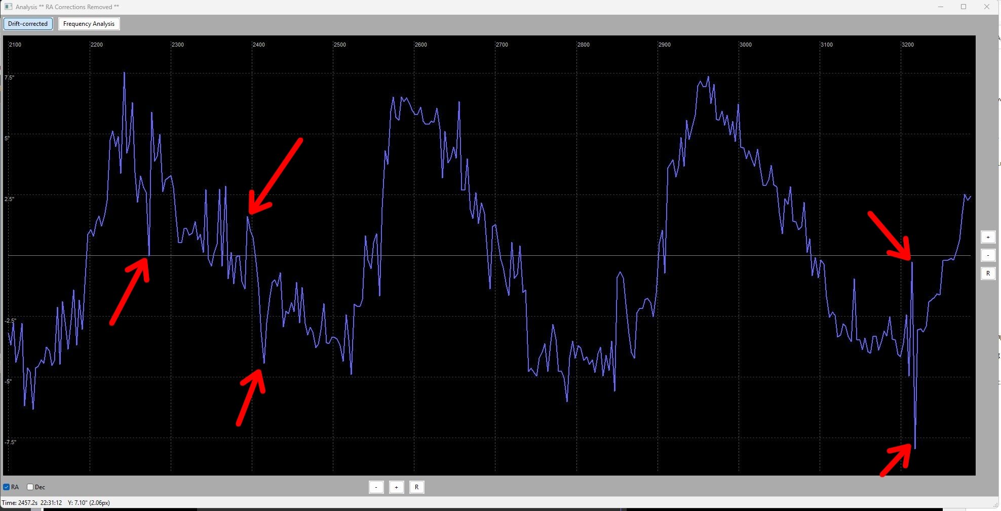 Une remarque sur l'EP, ce n'est pas vraiment sa valeur crête à crête qui est importante mais sa régularité. J'ai eu une NEQ6 avec une EP de 60" crête à crête (oui oui, 60") mais très lisse. Le guidage était très souvent de l'ordre d'un RMS de 0.8" et moins les nuits calmes. Ce qui pêche avec ta monture c'est les pics, ça c'est presque impossible à tenir en guidage..