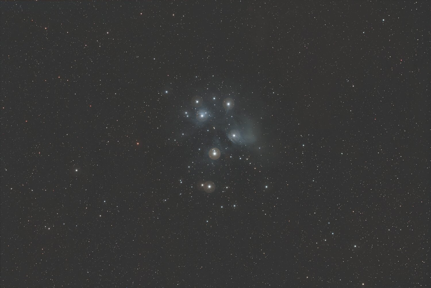 Bonjour, as tu essayez d'observer un autre amas ou même une simple  étoile, parce que tons image  représente M45 ou les Pleiades, ou Subaru ou encore les 7 soeurs. Il y a un nuage de gaz et de poussière qui passent devant ces étoiles.