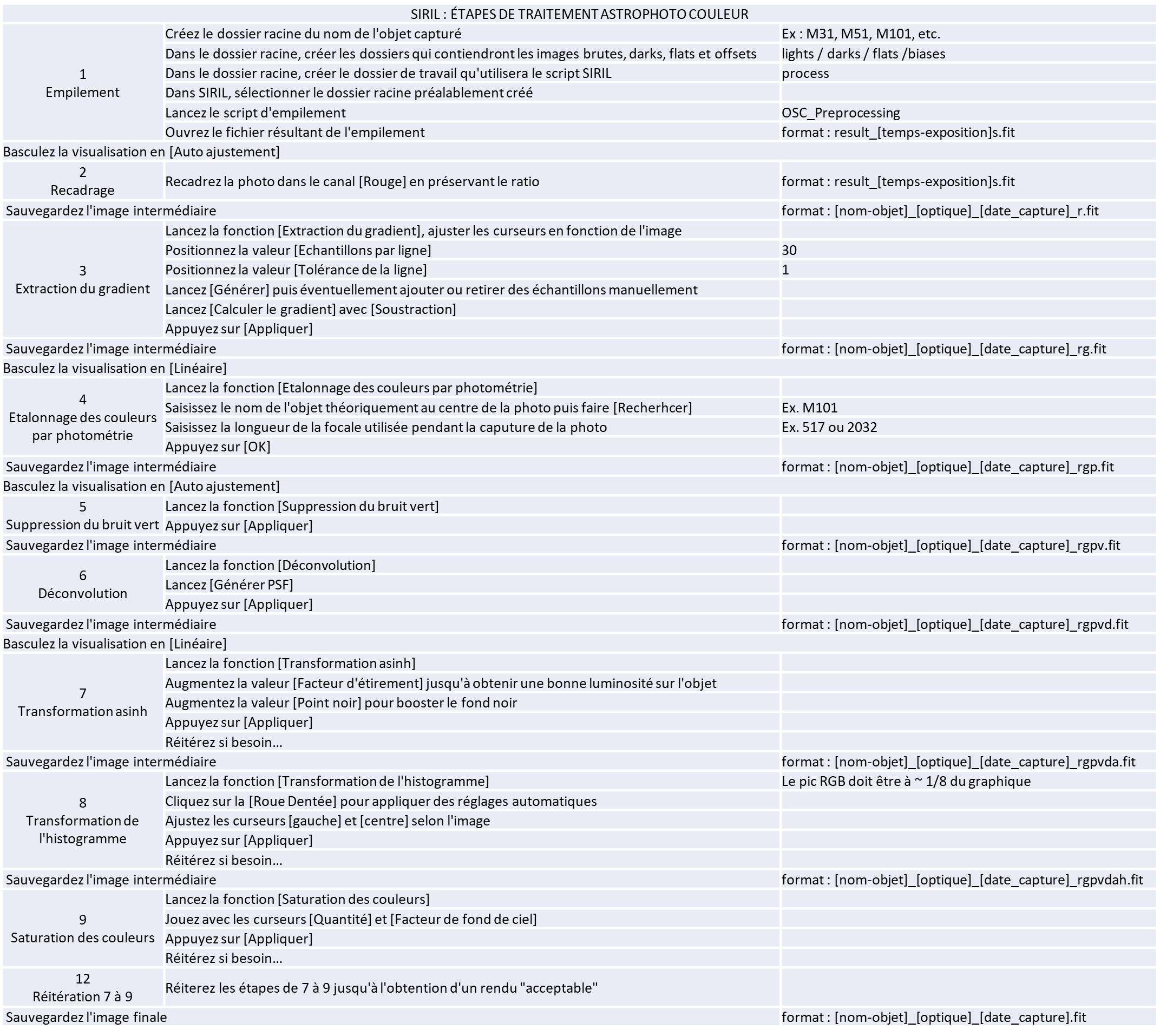 pe78420 Posté 10 avril Posté 10 avril (modifié) Bonjour à tous, Je me (re)lance sur SIRIL... Je lis des tas de guides, de tutos, de posts à droite et à gauche... et j'ai fini par compiler dans un tableau Excel, une check-list très approximative. 😇 Quelqu'un aurait-il la gentillesse de jeter un œil sur cette check-list ci-dessous et me dire ce qu'il en pense ? Dans l'attente de vous lire... Philippe Modifié 20 avril par pe78420