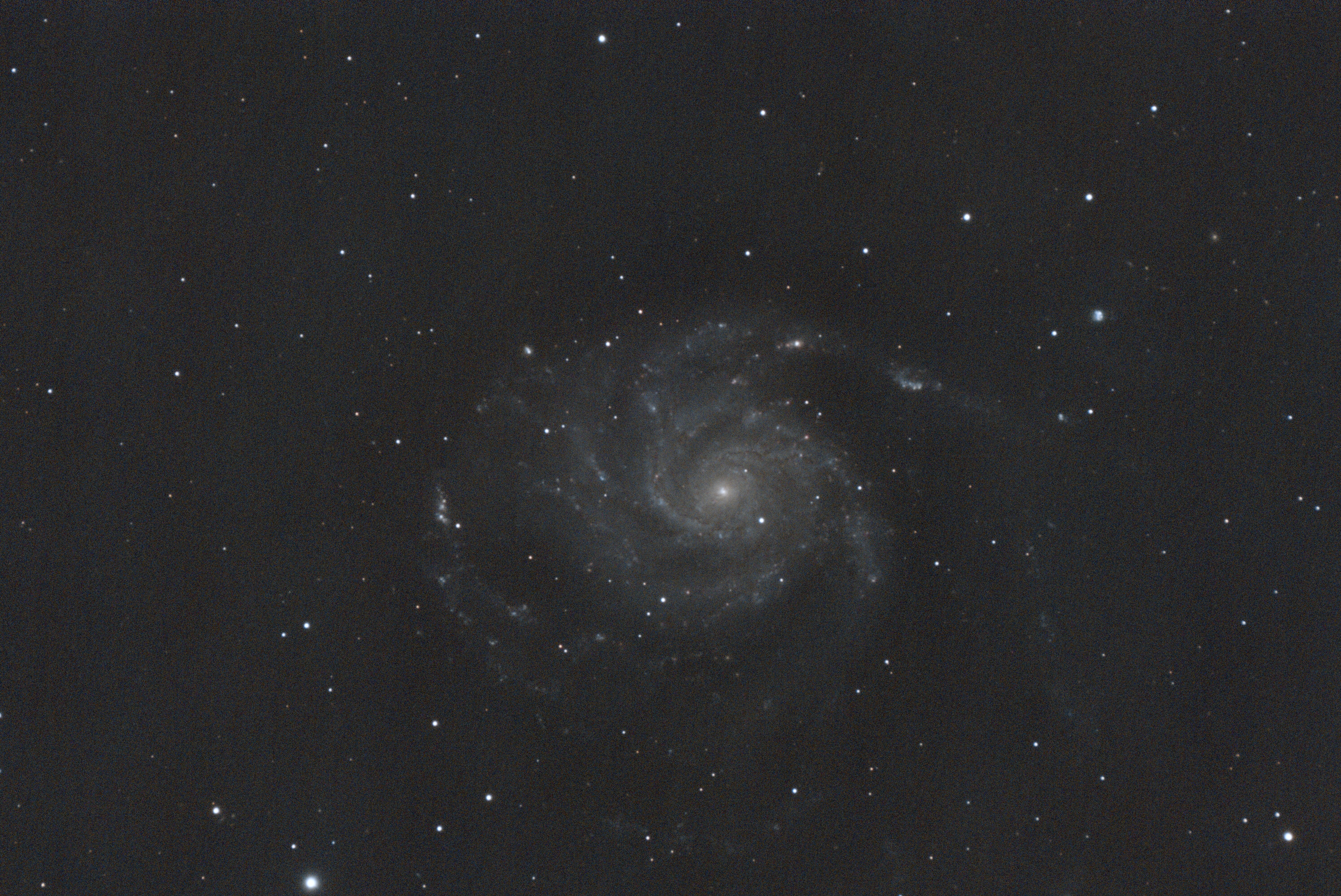 pe78420 Posté 13 avril Auteur Posté 13 avril (modifié) Olivier-Fantasy, soit indulgent ! 😇 L’image de M101 ci-dessous provient d’un empilement SIRIL de 183 frames de 60s prise avec une ASI2600MC (expo : 60s, gain : 100, Offset : 50) montée sur un C8 Edge HD sans réducteur et avec un filtre L-PRO, le guidage est sous PHD2 et le tout est contrôlé par SharpCap en Live Stacking. Les conditions de ciel sont ceux de la région parisienne le 12 avril de cette année. Application de ce que j’ai cru comprendre dans ta longue réponse : Un léger recadrage Une extraction de gradient, avec les valeurs par défaut Un étalonnage des couleurs par photométrie Une transformation de l’histogramme en appliquant l’algorithme d’auto-ajustement (car je n’arrive pas à trouver un truc quelconque en jouant avec les curseurs…) Un peu de transformation asinh pour assombrir le ciel profond Suppression du bruit vert (ça rougit) Étalonnage des couleurs en manuel De nouveau un peu de transformation asinh pour assombrir le ciel profond De la saturation de couleur, mais qui ne donne rien de particulier à mes yeux Le résultat : Qu'en penses-tu ? Dans l'attente de te lire... Philippe Modifié 13 avril par pe78420 1 1