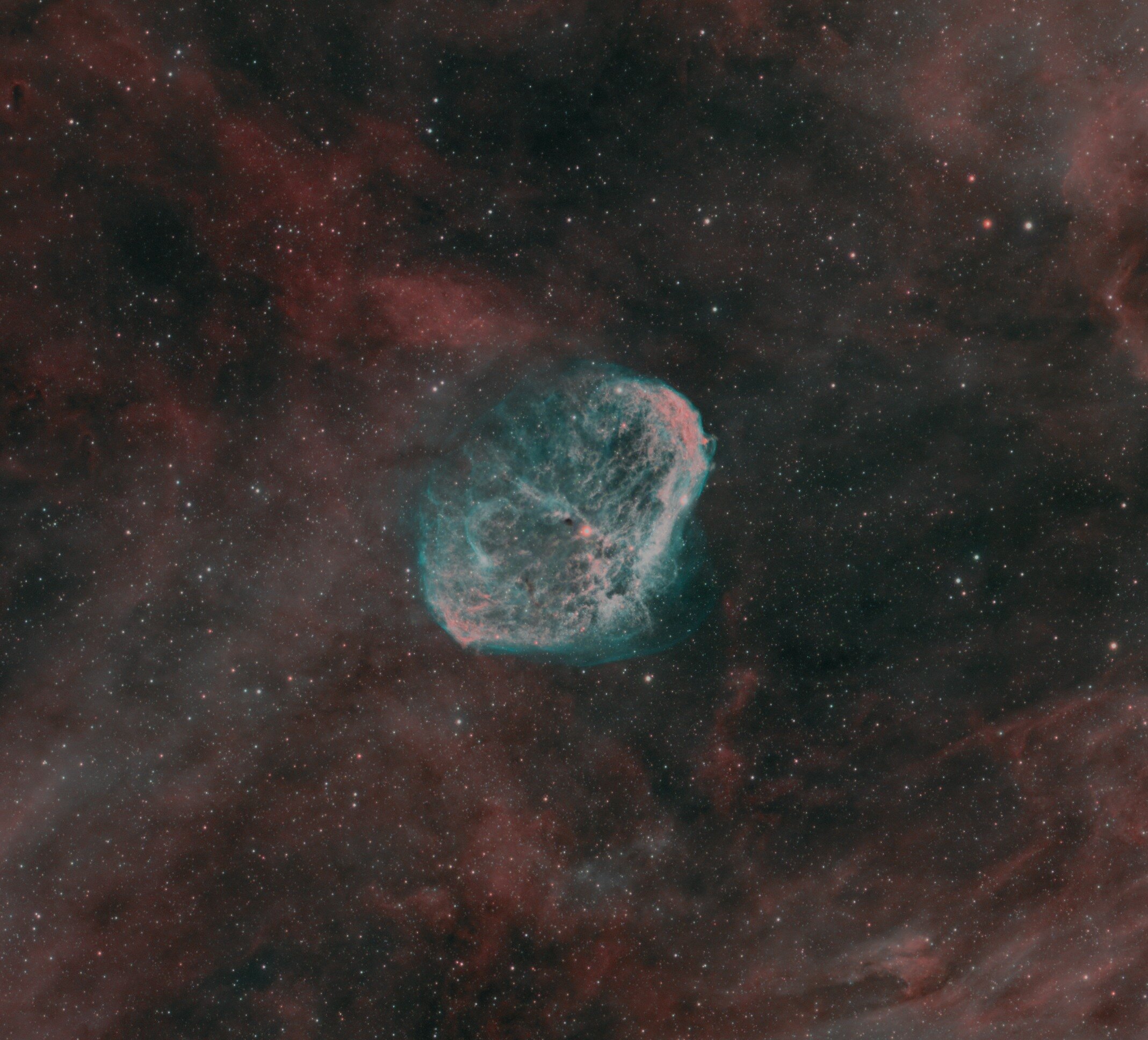 et une question. Un truc que je ne connaissais pas ; une petite bulle en OIII en haut et légèrement décalée à gauche par rapport au centre. J'ai vérifié mes brutes et mon master flat, ça ne semble pas être un artefact. Savez vous quelle base puis-je consulter pour identifier cette objet? Mon astrométrie ne le connait pas...