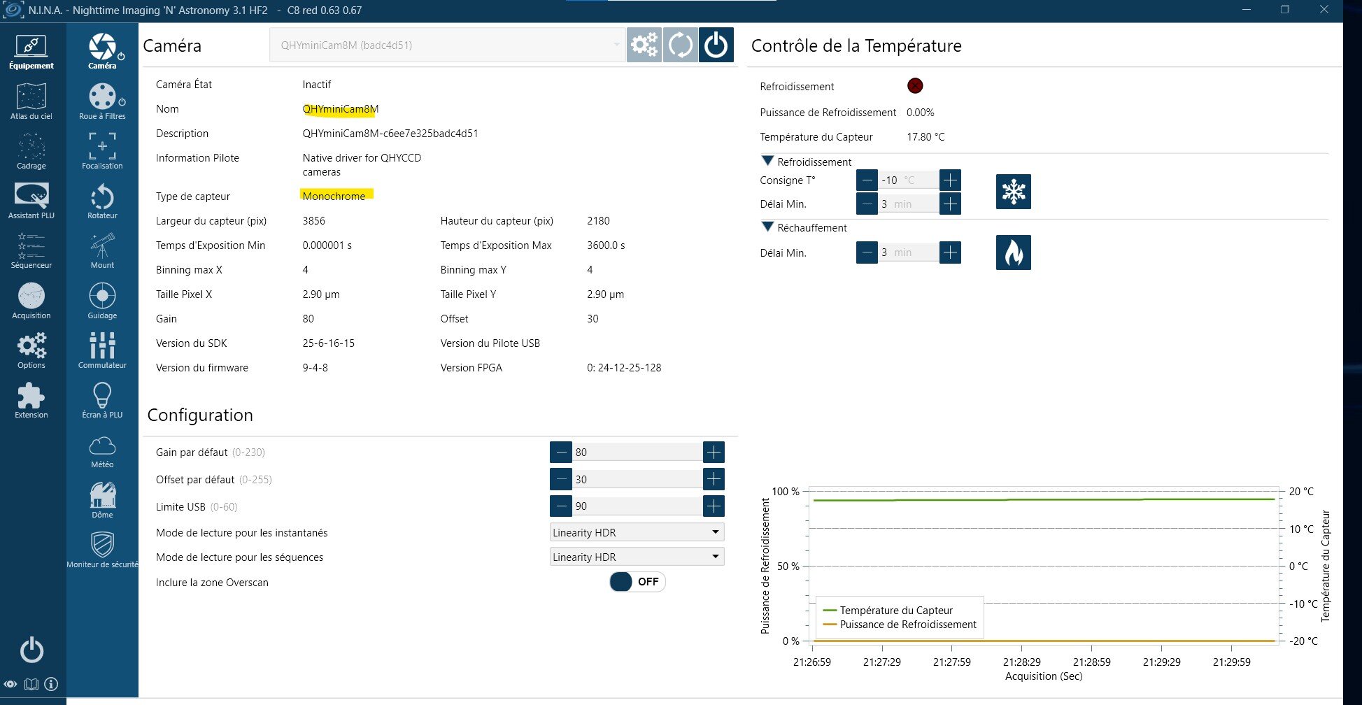 un peu déroutant car dans le setup de la caméra dans NINA j'avais les anciens réglages de la Player One, gain 120, offset 30.