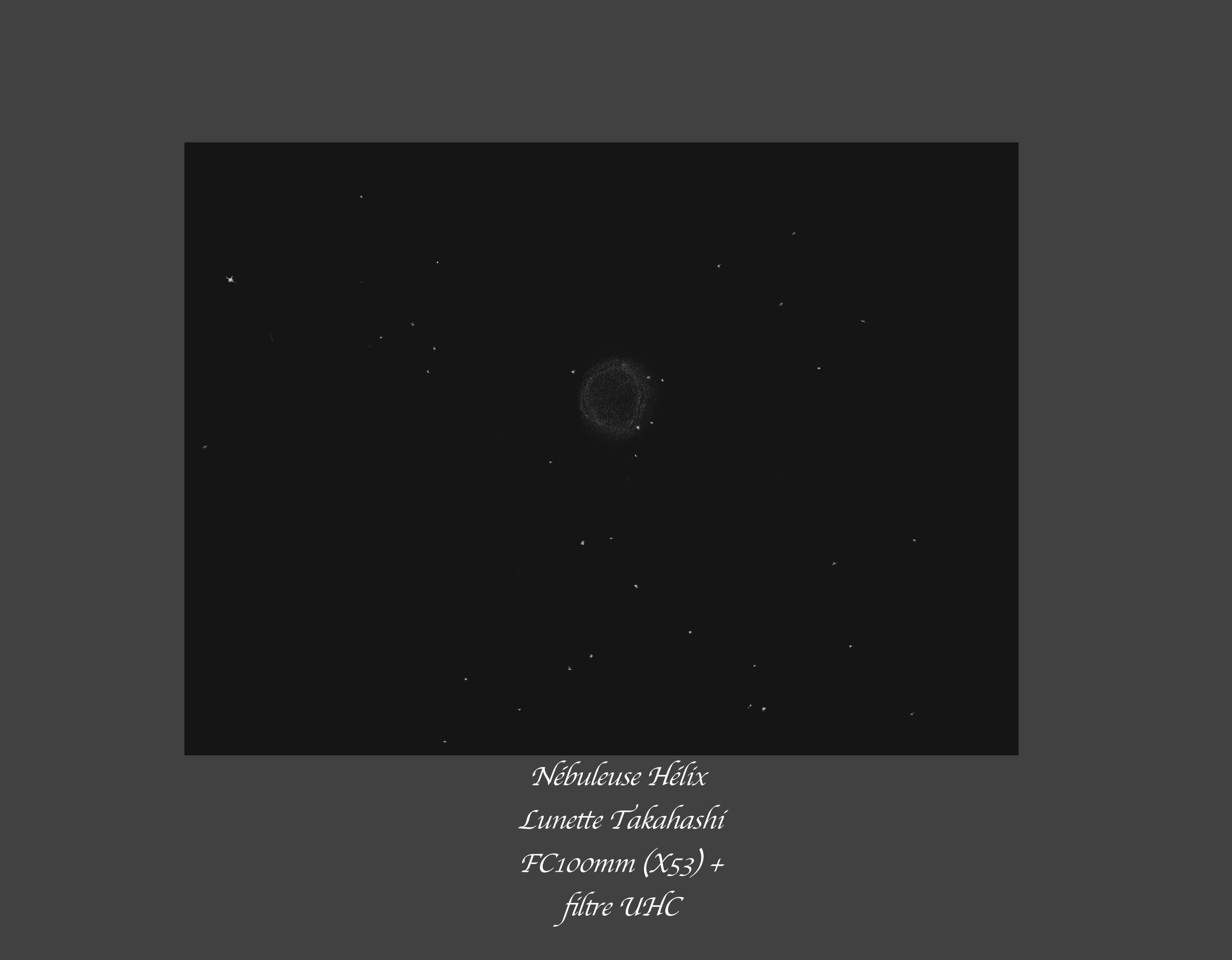 Commençons par la nébuleuse Hélix : sa taille ample et sa relative brillance en fait une cible de choix pour un tel instrument.  Equipé d'un filtre UHC, le résultat est remarquable : tout y est même à faible grossissement.