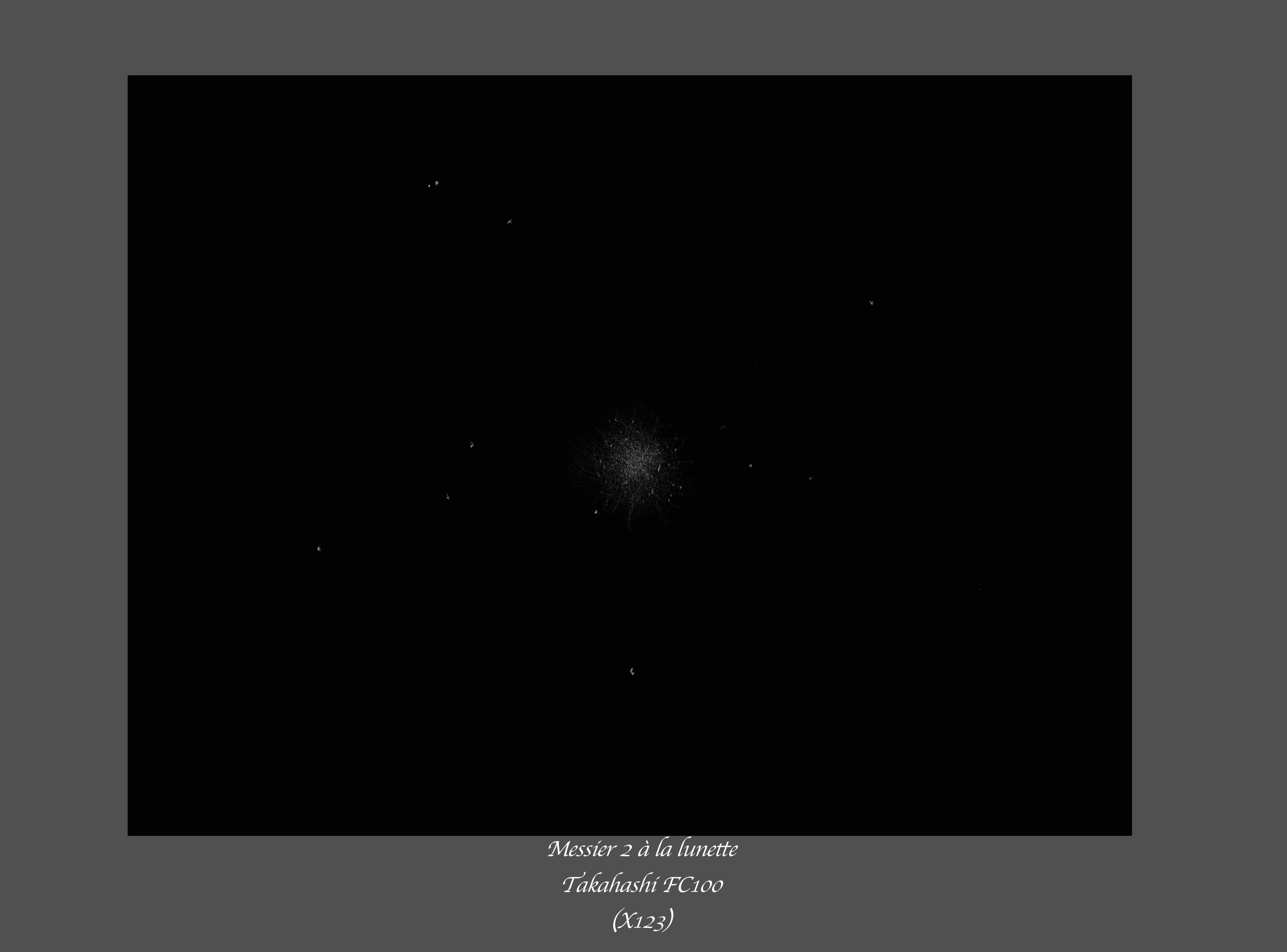 L'autre cible ne fut pas moins célèbre :  L'amas globulaire Messier 2. En toute honnêteté, le résultat est tout de même saisissant avec simplement 100mm. Le poudroiement est de mise, et surtout l'image ne souffre d'aucun défaut de mise au point. C'est nickel et la résolution est plus qu'honorable !