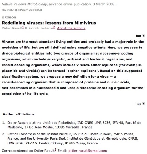 Oui, c'est intéressant, ils proposent une nouvelle définition pour les virus, basée sur une nouvelle "suggested" classification des organismes vivants, d'un côté les eucaryotes, bactéries... et de l'autre un truc qui réplique avec principalement les virus. Il faudrait en lire plus...:cool: