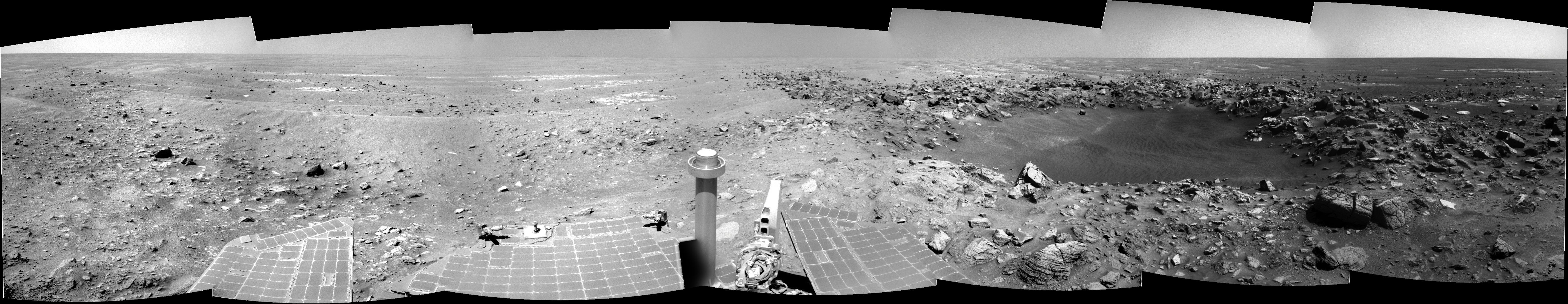 bon des nouvelles d'Opportunity, il est rentré dans le cratere Victoria vers mi 2006 je crois...ça devait etre son cimetierre...pas fous a la nasa!!!: ils lui fait faire le tour pendant 1 an, puis il est descendu prudement a mi pente et à photographié les couches sédimentaires, tres visibles,ceci pendant un an.