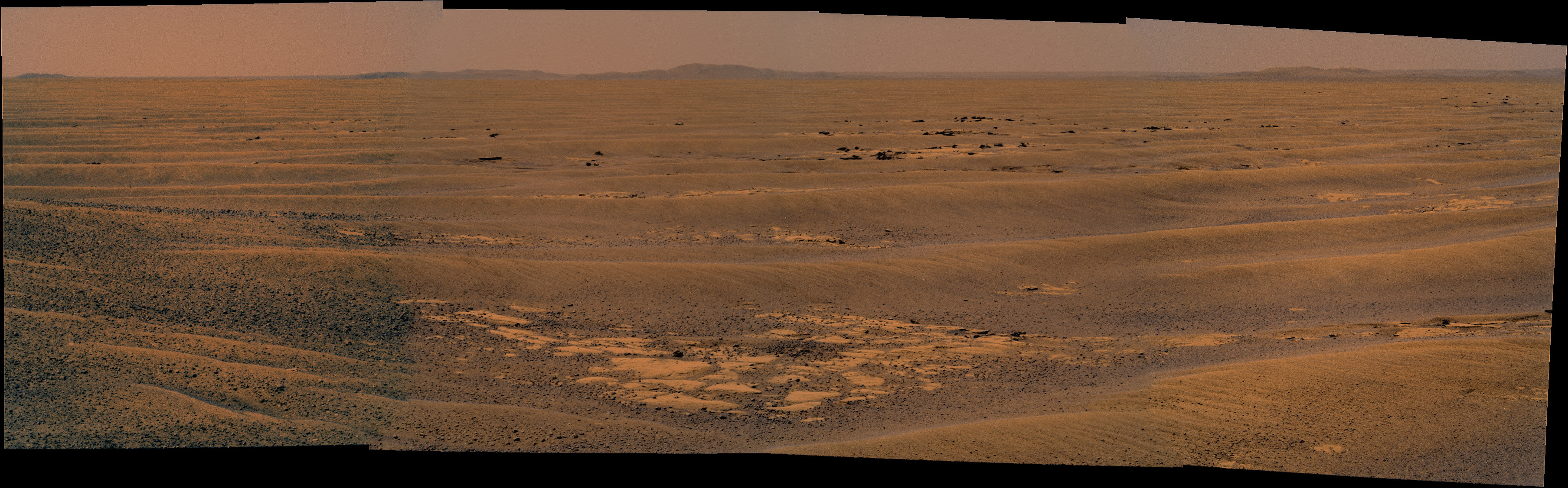 Un petit mot pour signaler que la route d'Oppy se dégage. Avec de moins en moins de dunes, il va pouvoir rouler plus vite, non seulement parce que c'est plus facile de rouler sur la roche que sur le sable (comme nous à la plage !), mais aussi parce que son logiciel de navigation autonome avait tendance à se mélanger les pinceaux avec les dunes trop rapprochées (essayez de faire le jeu des sept erreurs entre deux dunes, vous comprendrez).