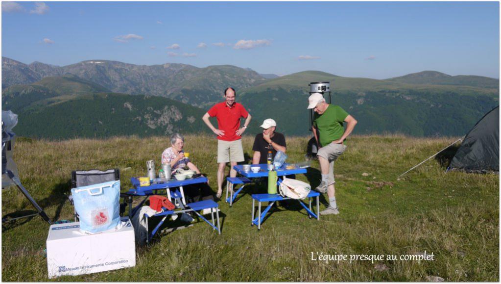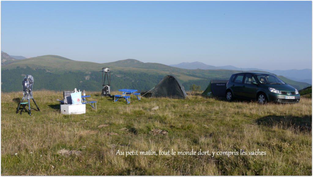 - 2ème nuit, très bonnes images en début de nuit (Saturne supportait le 400x à l'aise). Transparence assez moyenne, surtout à l'horizon, mais région zénithale potable. Vers 2h (?) un vent modéré de sud sud-ouest à incité la plupart d'entre nous à plier, j'ai bien fait d'insister car ce vent est tombé à 0km/h environ 1h30 après ! Pas d'humidité, pas de nuage, des vaches en masse.