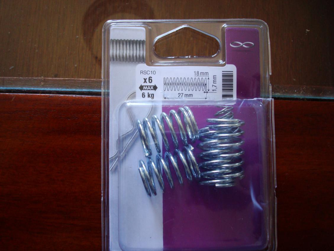 @ Arnaud : Les ressorts ça marche bien, par contre obligé de les couper au 3/4, sinon ils sont trop longs. Et crois-moi c'est galère de les couper. Je t'ai mis une image des ressorts. EN fait si tu peux passer à Leroy Merlin et en trouver des "un peu plus petits" c'est aussi mieux ;)