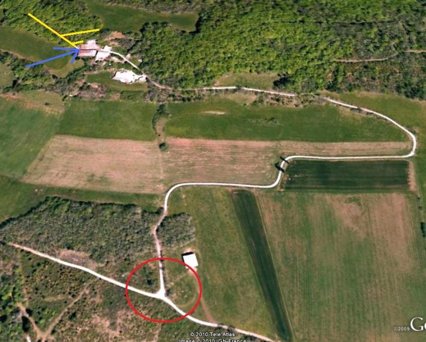 - Le rond rouge, c'est le croisement dont je parlais (quand on vient de la route principale ou de la calmette).