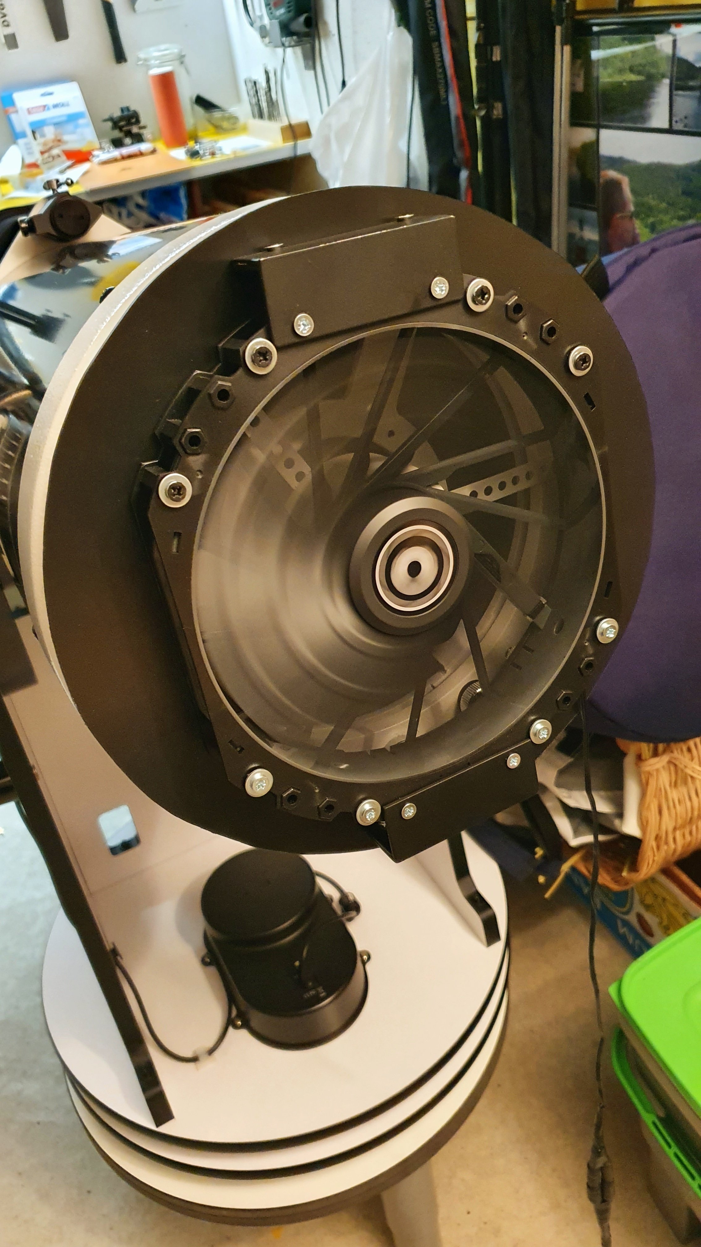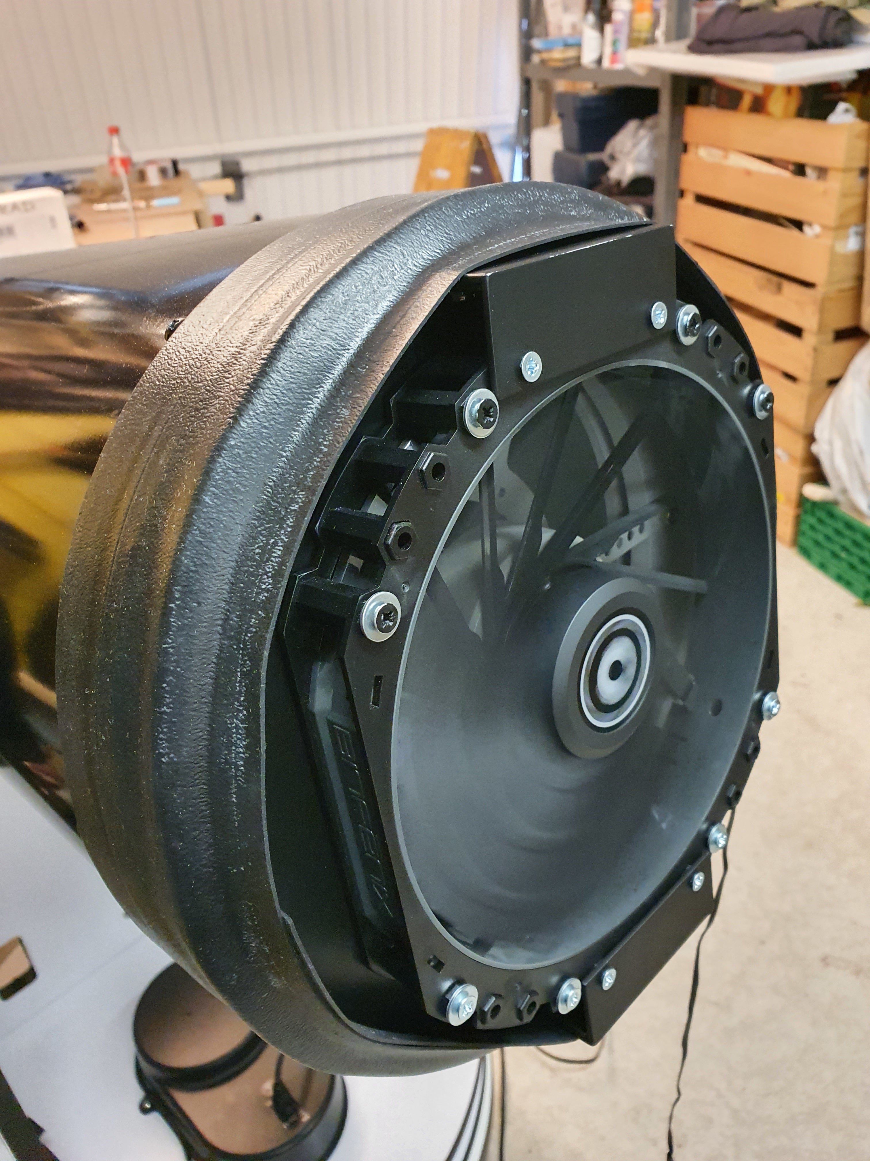 Pour favoriser le balayage de l’air sur le miroir, il est souhaitable d'avoir une plaque de fond (derrière le barillet primaire) qui fait pseudo-étanchéité avec l'arrière du tube. Le ventilateur est fixé sur cette plaque et souffle l'aireautour du miroir.