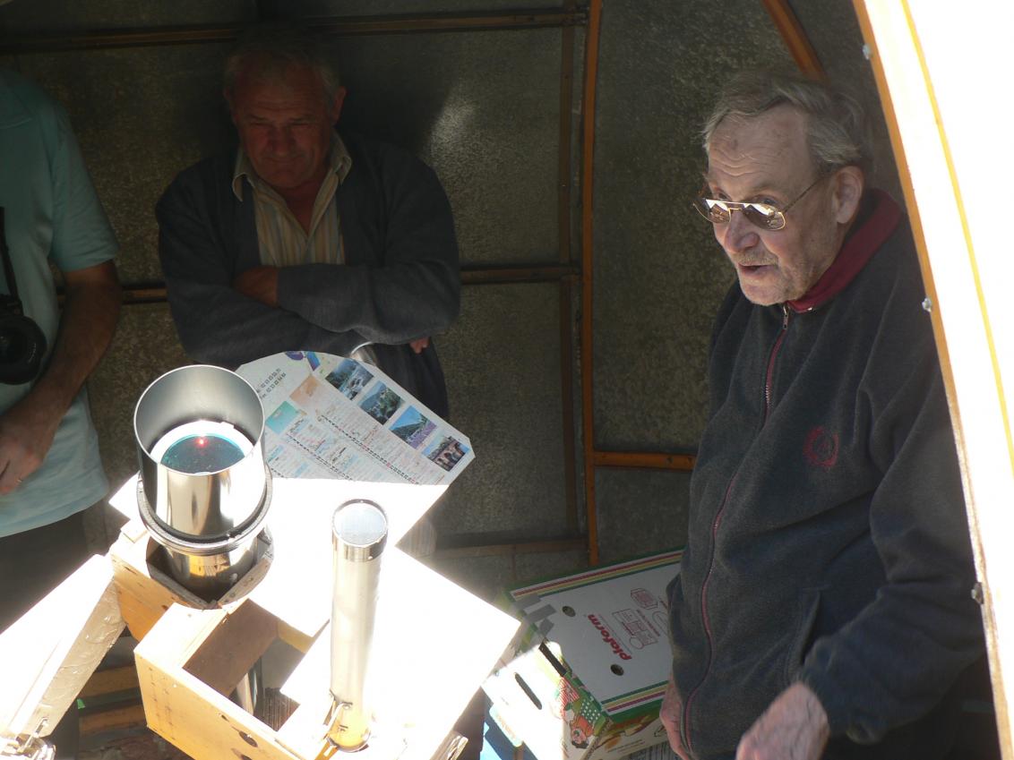 Sous un beau ciel bleu et un Soleil énergique, nous avons le plaisir et l'honneur d'être reçus par ce personnage mythique de l'astronomie amateur, qui nous présente son installation à observer le Soleil, dans une coupole installée dans le jardin de sa maison. Si j'en crois le programme concocté par Régine et Stéphane, la config installée s'appelle un cinécoronographe automatique.