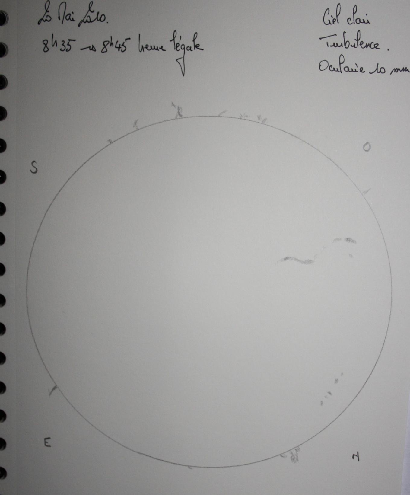 Très beau ciel en Bretagne. Oui il y a plusieurs très belles protus, quelques filaments et peut-être la naissance d'une nouvelle tâche : voir http://www.spaceweather.com/ . On voit bien cette nouvelle zone active.