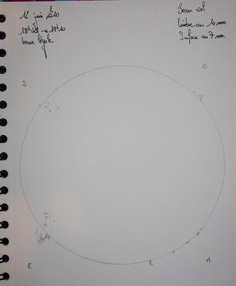 Les taches actuelles ( sud ) sont relativement importantes, je n'ai pas mesuré, mais sans doute de l'ordre de 15 000 km ( Terre 12 756). Pour voir les taches à l'oeil nu ( mais avec protection ), il faut qu'elle fassent 36 000 km de diamètre ( 4" ).