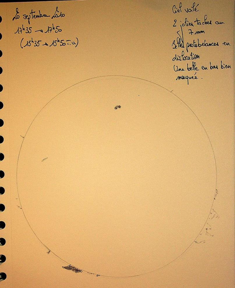 Bonsoir à tous:).Bravo pour ces clichés réalisés en fonction des moyens et du "métier" de chacun.Gaio,c'est un bon début à mon avis,Fred,belles images bien détaillées:)!!Etienne,notre premier imageur solaire depuis le début de l'aventure,tu nous offres des images superbes:):)!!Et bien sur,Christian avec un dessin de toute beauté:):)!!