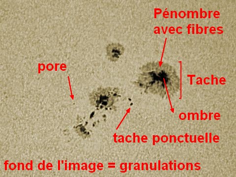 "On trouve souvent des petites régions éparses dans la granulation photosphérique. La matière qui les constitue est plus sombre que la matière intergranuleuse, sans toutefois être aussi noire que l'ombre des taches : ce sont les pores. Ils peuvent se former et se dissoudre en l'espace de quelques minutes à moins d'une heure. Leur taille est de l'ordre de 1" à 5"."