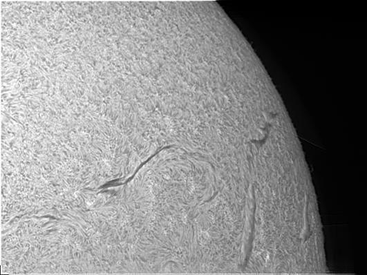 Ciel super bas, mais bien stable et transparent par ici. Une éruption rapide partie en protu de 11h30 à 12h (heure locale). Ca a commencé tout petit, bien blanc pour s'éloigner jusqu'à ~1/5 du disque, ensuite une partie est retombée sur la surface, l'autre devenait de plus en plus tenue, jusqu'à disparaître complètement. Quelqu'un l'a vue?