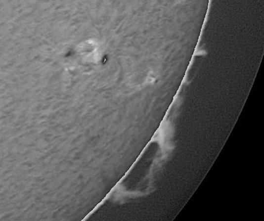 Ce matin grand ciel bleu ( comme Stephane ) avant les nuages qui commencent à se faire présent. J'ai sorti tout le matos : LB, H-alpha . Du coup une trentaine de films à traiter. En LB plusieurs groupes de taches ( ca fait plaisir ). En H-Alpha il y a une superbe arche qui se déploie. A surveiller !!!!!!!!!!!!!!!!