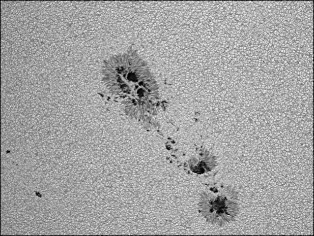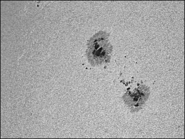 Enfin de belles taches à la surface de notre étoile. Une belle éclaircie ( pas assez longue toutefois ) m' a permis de faire des images en LB. Cela faisait longtemps que je n'avais pas pu en faire. L'arrivée de gros nuages m'a empêché de réaliser un full disc !!!